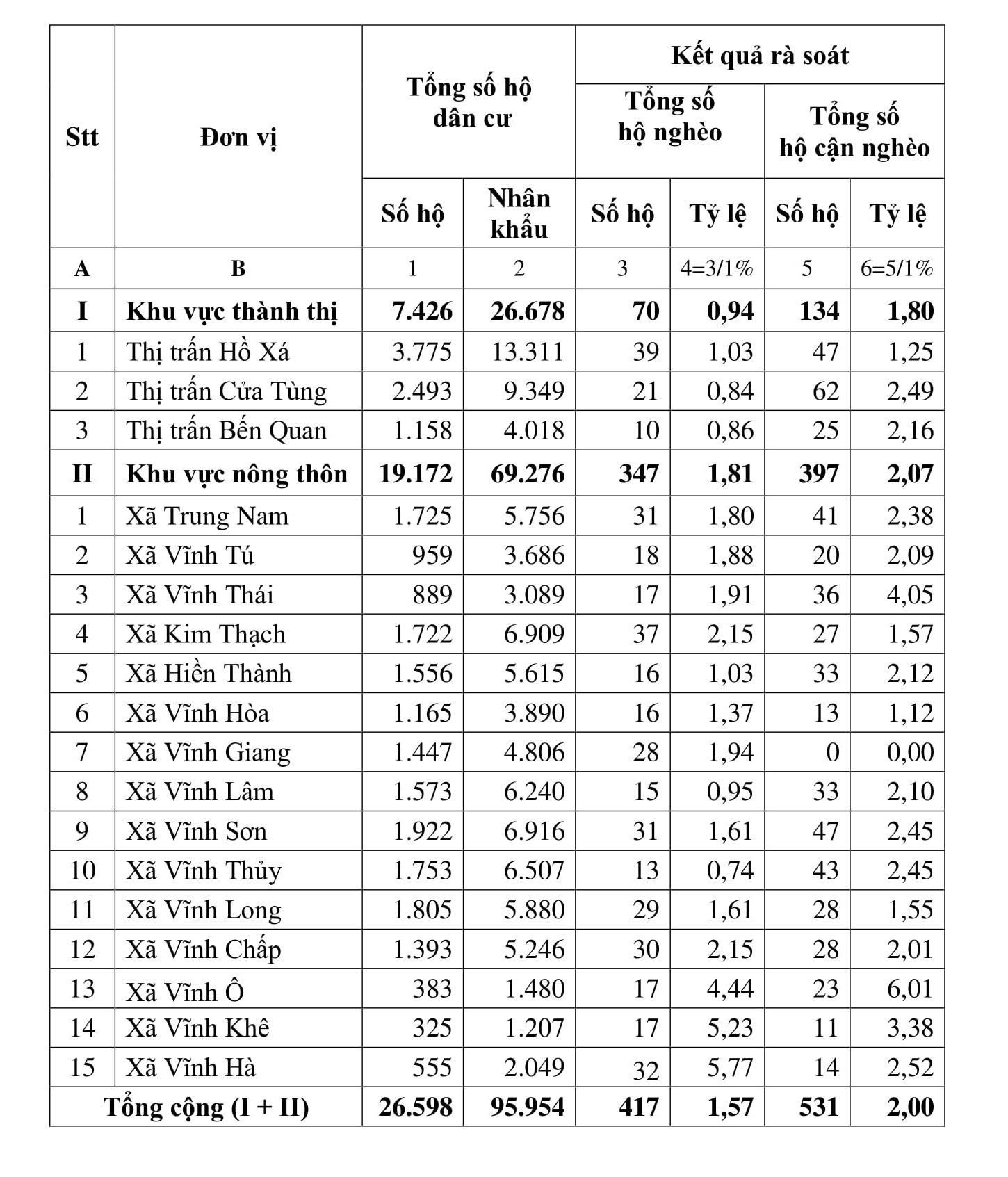 Một số địa phương có tỷ lệ hộ nghèo thấp như: Vĩnh Thủy giảm còn 0,74%, Cửa Tùng 0,84%, Bến Quan 0,86%, Vĩnh Lâm 0,95%,...