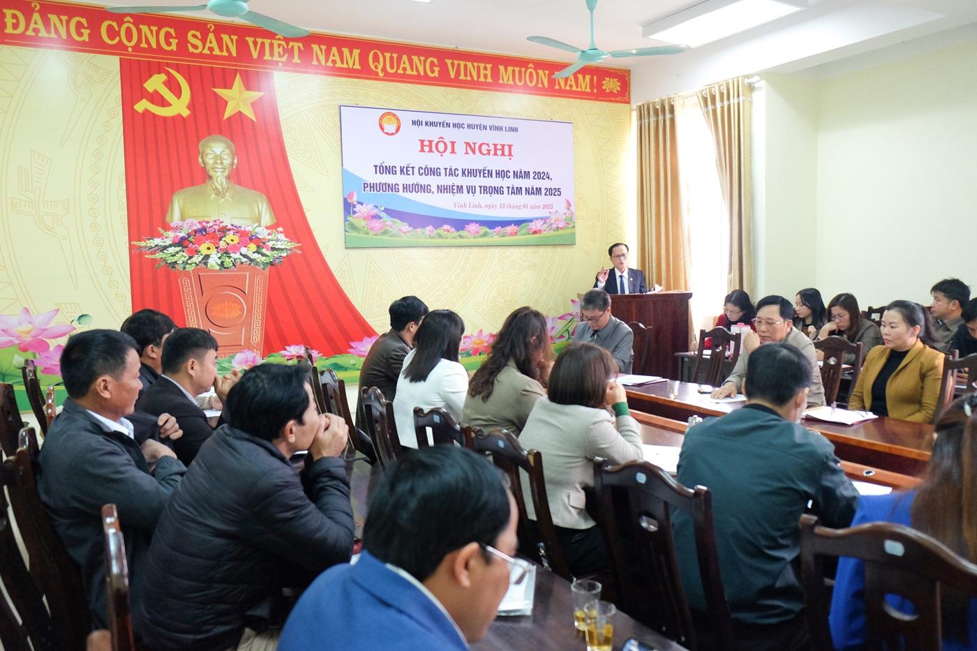 Về phương hướng, nhiệm vụ năm 2025, Hội Khuyến học huyện Vĩnh Linh xác định tiếp tục tham mưu cấp ủy, chính quyền địa phương tổ chức thực hiện có hiệu quả những kết luận, chỉ thị, quyết định về xây dựng xã hội học tập và đẩy mạnh phong trào học tập suốt đời trong mỗi công dân, gia đình, dòng họ, cộng đồng và đơn vị giai đoạn 2021 - 2030. Củng cố, phát triển tổ chức Hội. Chuẩn bị tốt điều kiện để tổ chức đại hội nhiệm kỳ theo quy định của điều lệ hội. Ký kết chương trình phối hợp với các đơn vị nhằm tạo sự gắn kết, chia sẻ và thúc đẩy hoạt động khuyến học - khuyến tài, xây dựng xã hội học tập…