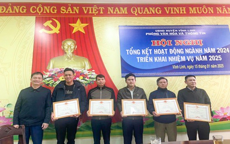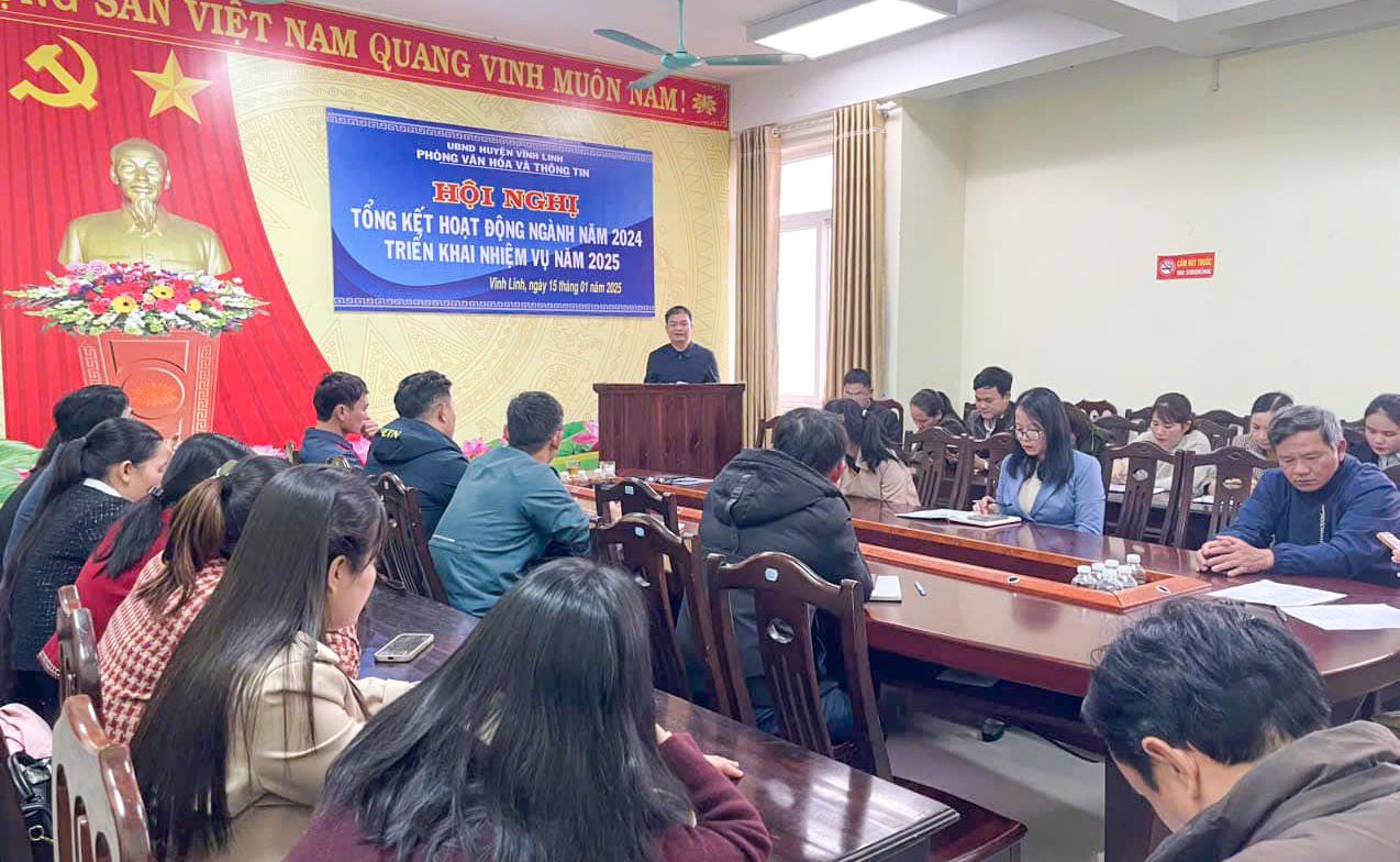 Chiều ngày 15/01/2025, ngành Văn hóa và Thông tin huyện Vĩnh Linh tổ chức hội nghị tổng kết công tác văn hóa - thông tin năm 2024, triển khai nhiệm vụ năm 2025. Đến dự có đồng chí Nguyễn Thiên Tùng- Phó Chủ tịch UBND huyện; lãnh đạo, công chức Phòng Văn hóa và Thông tin, Trung tâm Văn hóa- Thông tin và Thể dục thể thao huyện; cán bộ văn hoá, Đài Truyền thanh các xã, thị trấn trên địa bàn.