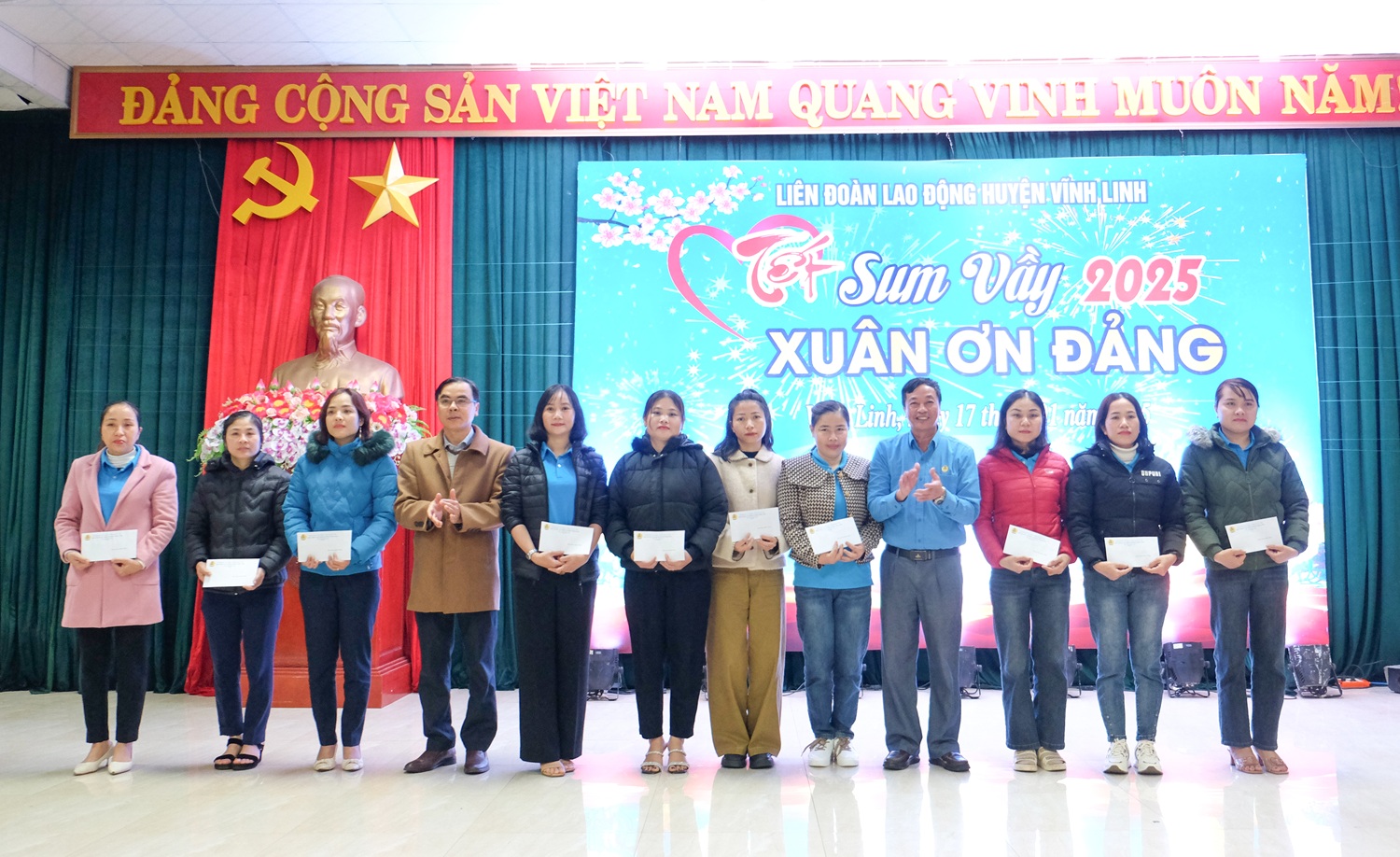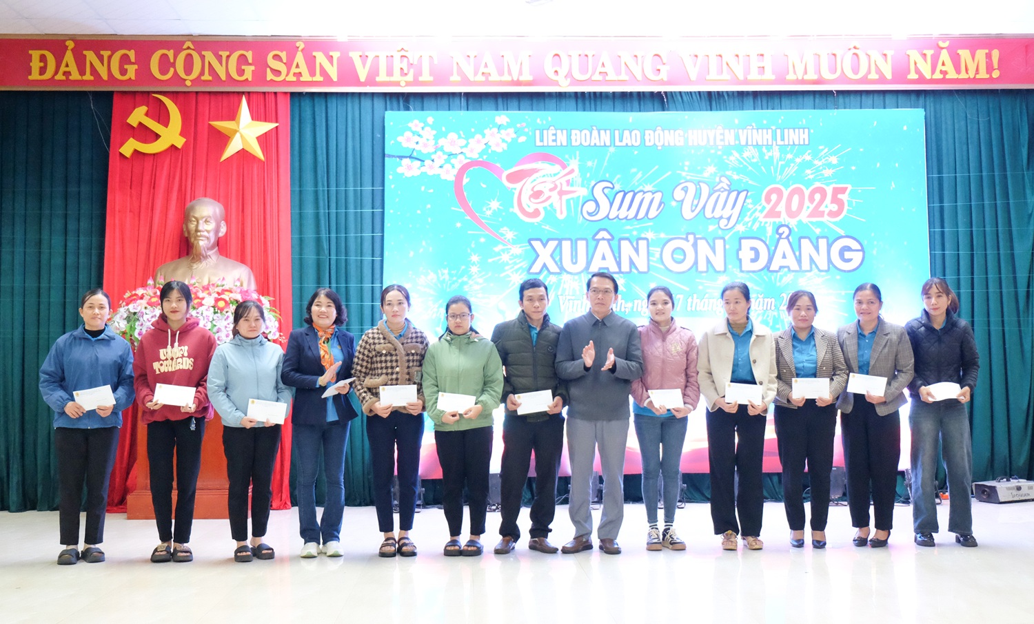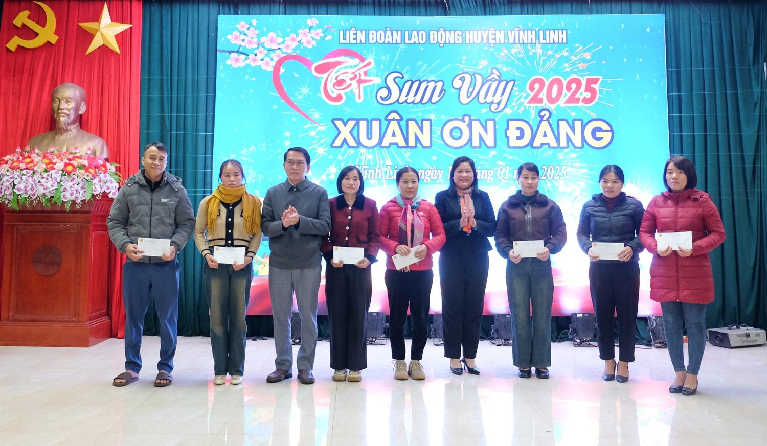 Ngày 17/01/2025, Liên đoàn Lao động huyện Vĩnh Linh đã tổ chức Chương trình “Tết sum vầy- Xuân ơn Đảng” năm 2025, nhằm mang đến một cái Tết trọn vẹn hơn cho công nhân viên chức (CNVC) và người lao động có hoàn cảnh khó khăn trên địa bàn. Đến dự có các đồng chí: Nguyễn Thị Hoài Lê- Phó Chủ tịch Thường trực LĐLĐ tỉnh, Vũ Văn Phong- Trưởng Ban Dân vận Huyện ủy, Nguyễn Anh Tuấn- Phó Chủ tịch UBND huyện, Nguyễn Thị Thu Hoài- Phó Chủ tịch UMBT huyện.