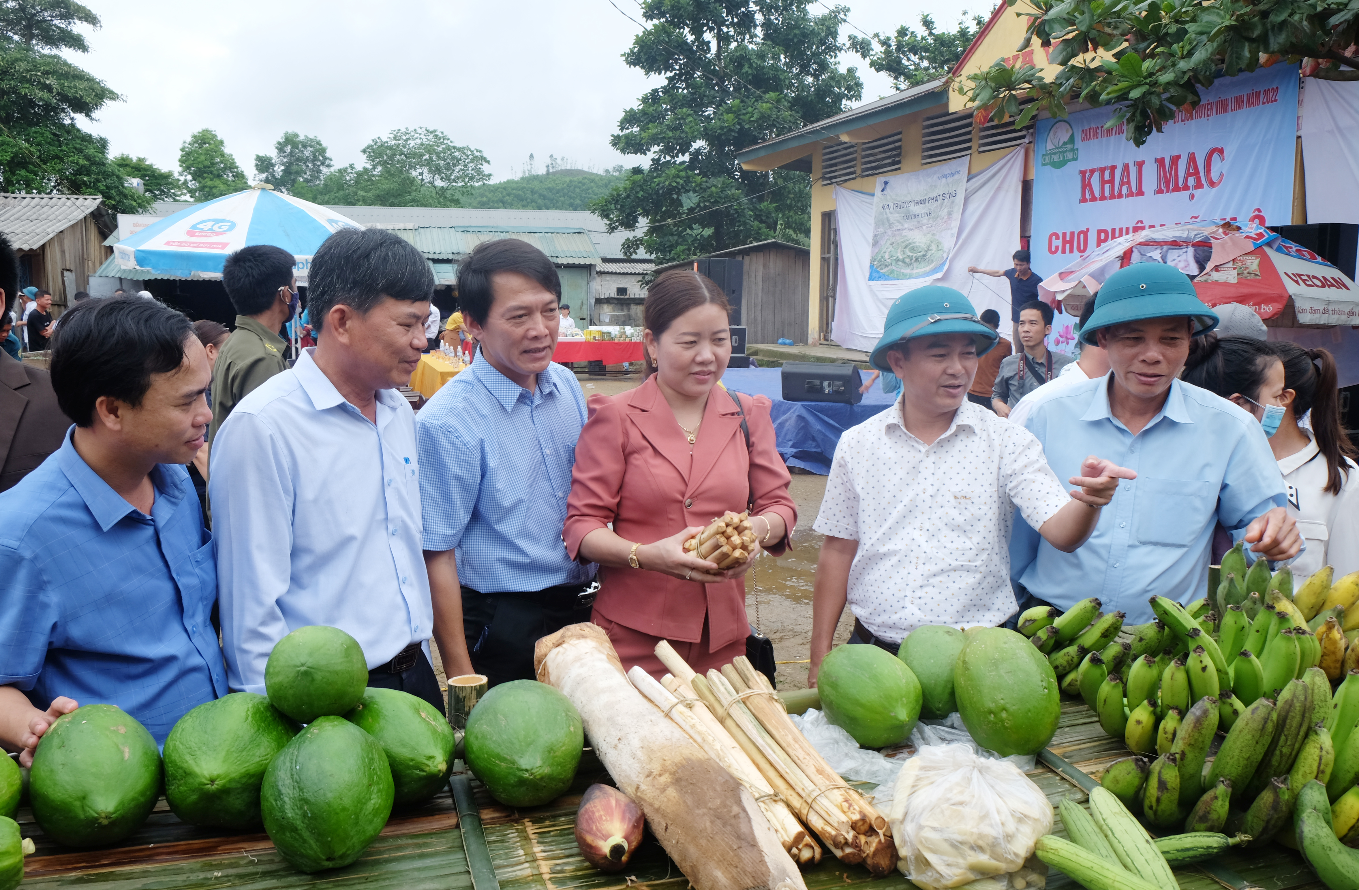 | Bí thư Huyện ủy Vĩnh Linh Trần Nhật Quang (người thứ 2, phải sang) dự khai mạc Chợ phiên Vĩnh Ô -Ảnh: HUVL cung cấp |