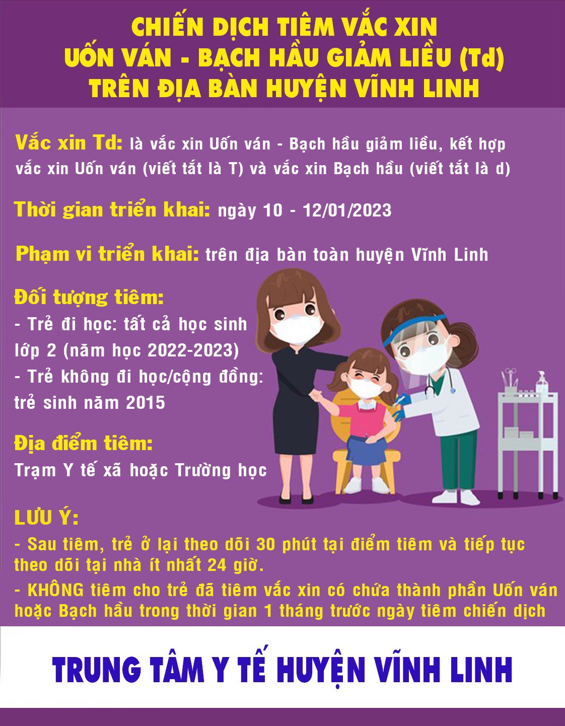 Thực hiện Quyết định số 1031/QĐ-BYT, ngày 29/4/2022 của Bộ Y tế về việc phê duyệt Kế hoạch tiêm bổ sung vắc xin uốn ván-bạch hầu giảm liều (Td) năm 2022 tại 32 tỉnh/thành phố; thực hiện Công văn số 1767/KSBT-PCBTN ngày 9/12/2022 của Trung tâm Kiểm soát bệnh tật tỉnh Quảng Trị về việc đề xuất triển khai tiêm bổ sung vắc xin uốn ván-bạch hầu giảm liều (Td); Công văn số 2425/SYT-NVY, ngày 22/12/2022 của Sở Y tế tỉnh Quảng Trị về việc triển khai chiến dịch tiêm vắc xin uốn ván-bạch hầu giảm liều (Td) cho trẻ 7 tuổi và học sinh lớp 2, Trung tâm Y tế huyện Vĩnh Linh xây dựng Kế hoạch triển khai thực hiện chiến dịch tiêm tại 18 xã, thị trấn trong toàn huyện với mục tiêu trên 95% trẻ 7 tuổi tại địa phương triển khai được tiêm bổ sung 01 mũi vắc xin uốn ván-bạch hầu giảm liều (Td) nhằm mục tiêu đề ra của chiến dịch là tăng tỷ lệ miễn dịch phòng bệnh bạch hầu và uốn ván cho trẻ em 7 tuổi chủ động phòng ngừa dịch bệnh, giảm tỷ lệ tử vong do bệnh bạch hầu và uốn ván.