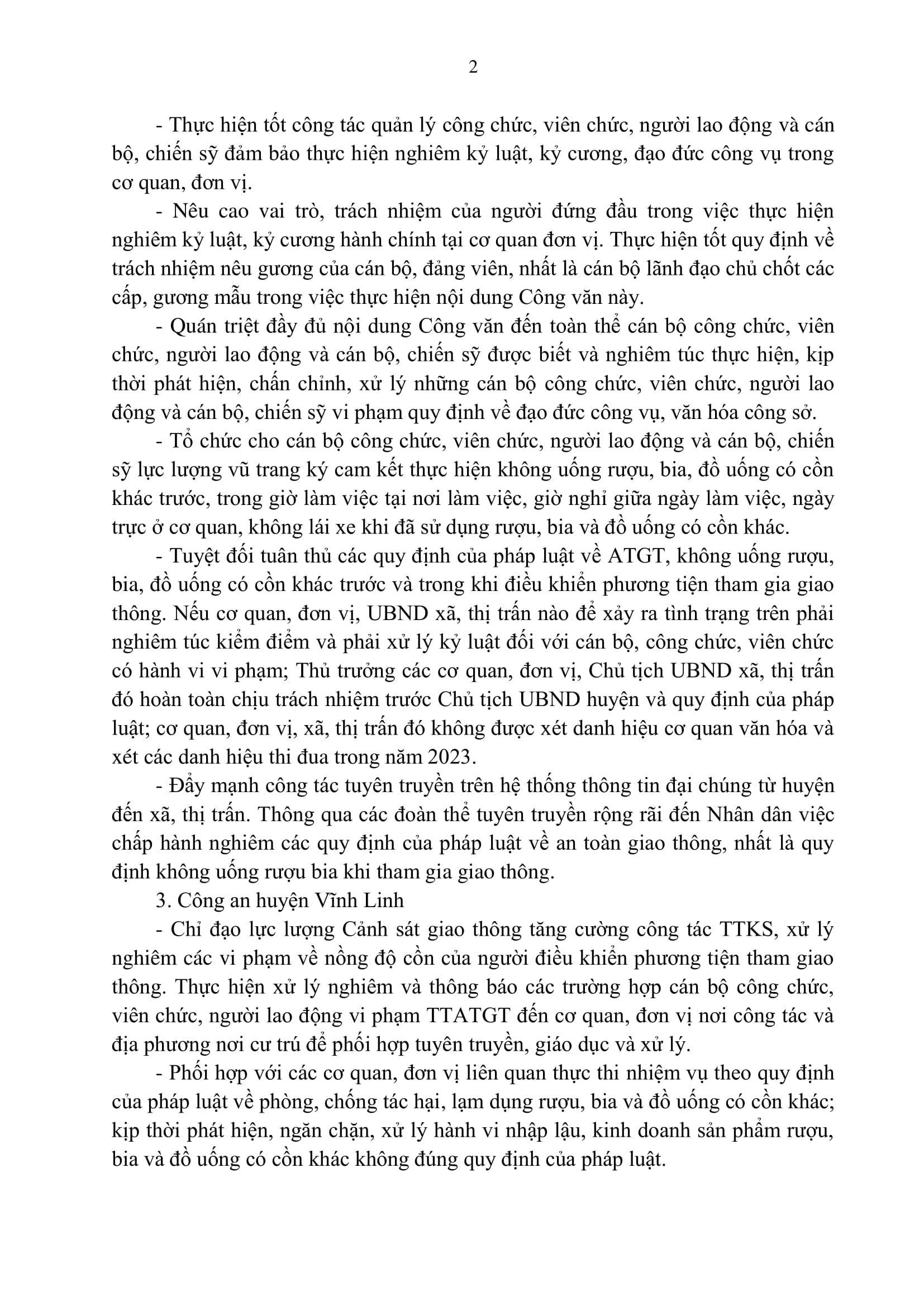 Ngày 18/1/2023, UBND huyện Vĩnh Linh có văn bản chỉ đạo chấn chỉnh tình trạng vi phạm Luật Phòng chống tác hại rượu, bia trước trong và sau Tết Nguyên đán Quý Mão.