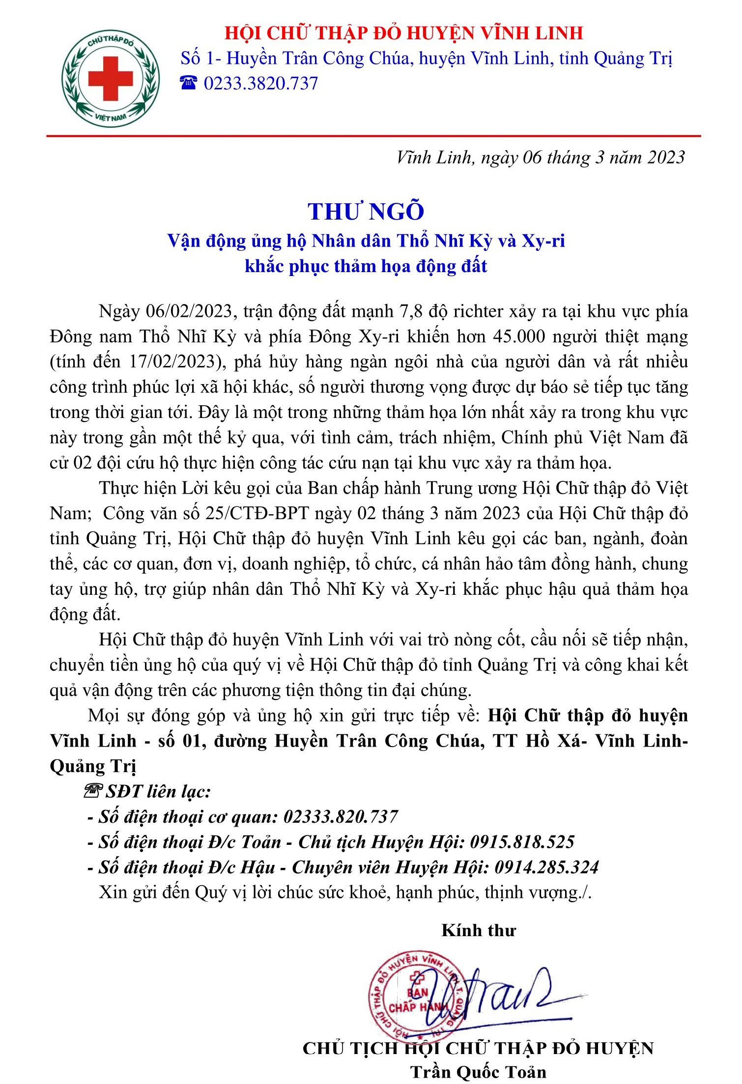 Thư ngõ của Hội CTĐ huyện Vĩnh Linh: Vận động ủng hộ Nhân dân Thổ Nhĩ Kỳ và Xy-ri khắc phục thảm họa động đất