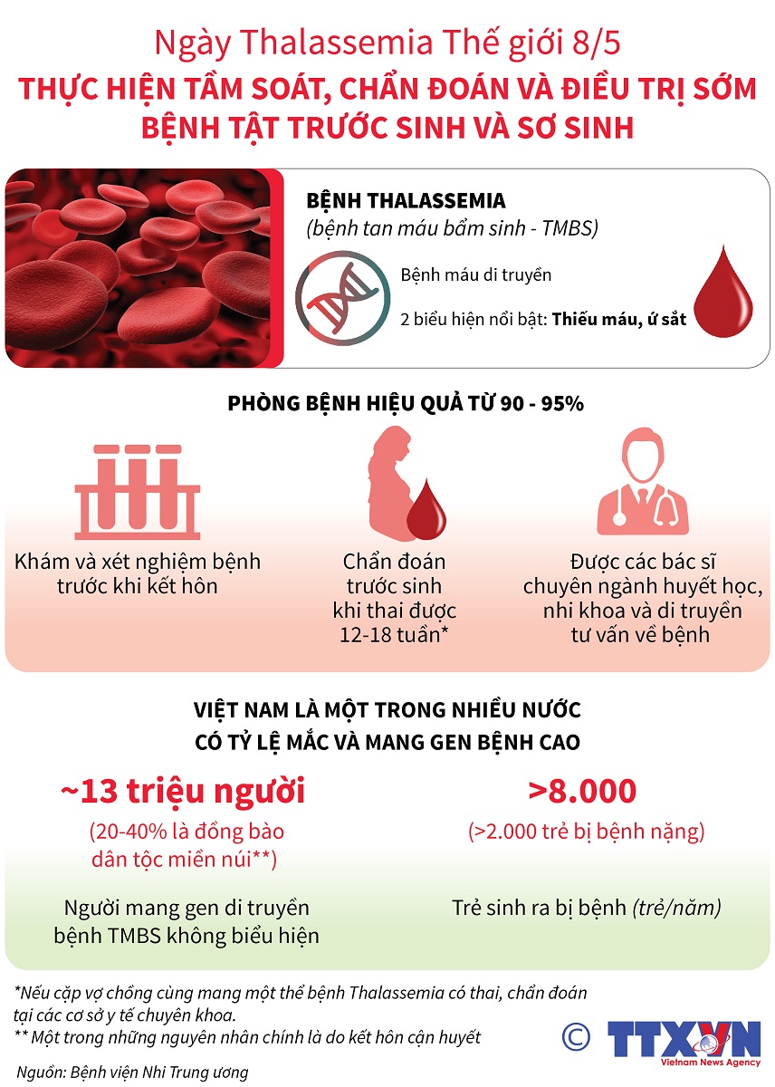 Thalassemia (còn gọi là Bệnh tan máu bẩm sinh) được thế giới phát hiện và nghiên cứu từ năm 1925. Tại Việt Nam, bệnh được các nhà khoa học nghiên cứu vào năm 1960. Bệnh có tỉ lệ gặp phải cao trong các bệnh bẩm sinh, với những biểu hiện chính là thiếu máu và thừa sắt, bệnh nhân Thalassemia cần phải được truyền máu và dùng thuốc thải sắt suốt đời. Người mắc bệnh tan máu bẩm sinh sẽ bị giảm khả năng lao động và sinh hoạt gây nên những gánh nặng cho gia đình và cộng đồng.