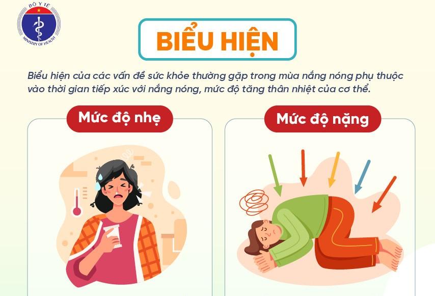 Biểu hiện của các vấn đề sức khỏe thường gặp trong mùa nắng nóng phụ thuộc vào thời gian tiếp xúc với nắng nóng, mức độ tăng thân nhiệt của cơ thể.