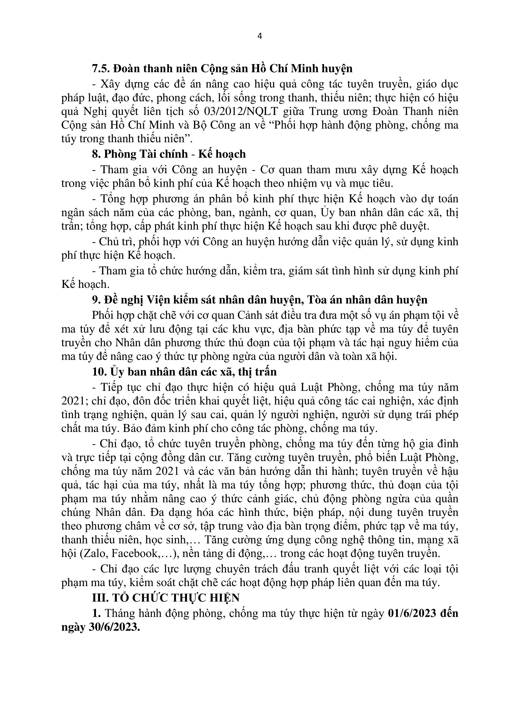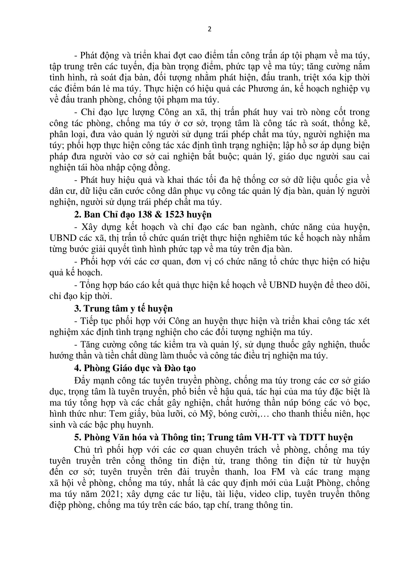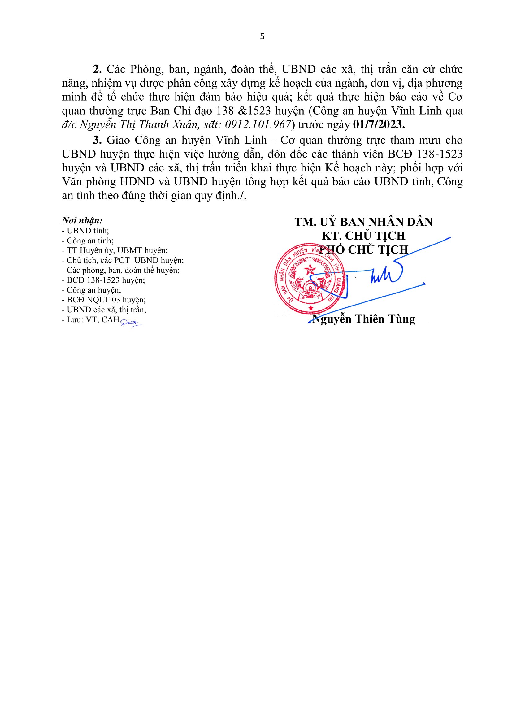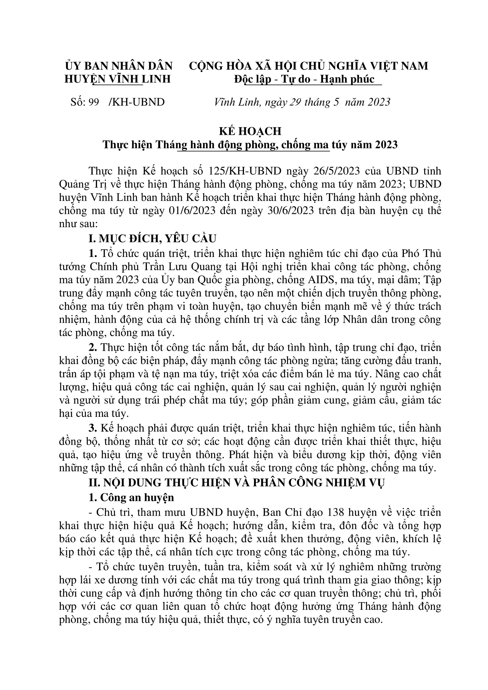Ngày 29/5/2023, UBND huyện Vĩnh Linh ban hành Kế hoạch triển khai thực hiện Tháng hành động phòng, chống ma túy diễn ra từ ngày 1/6 đến ngày 30/6/2023 trên địa bàn huyện.