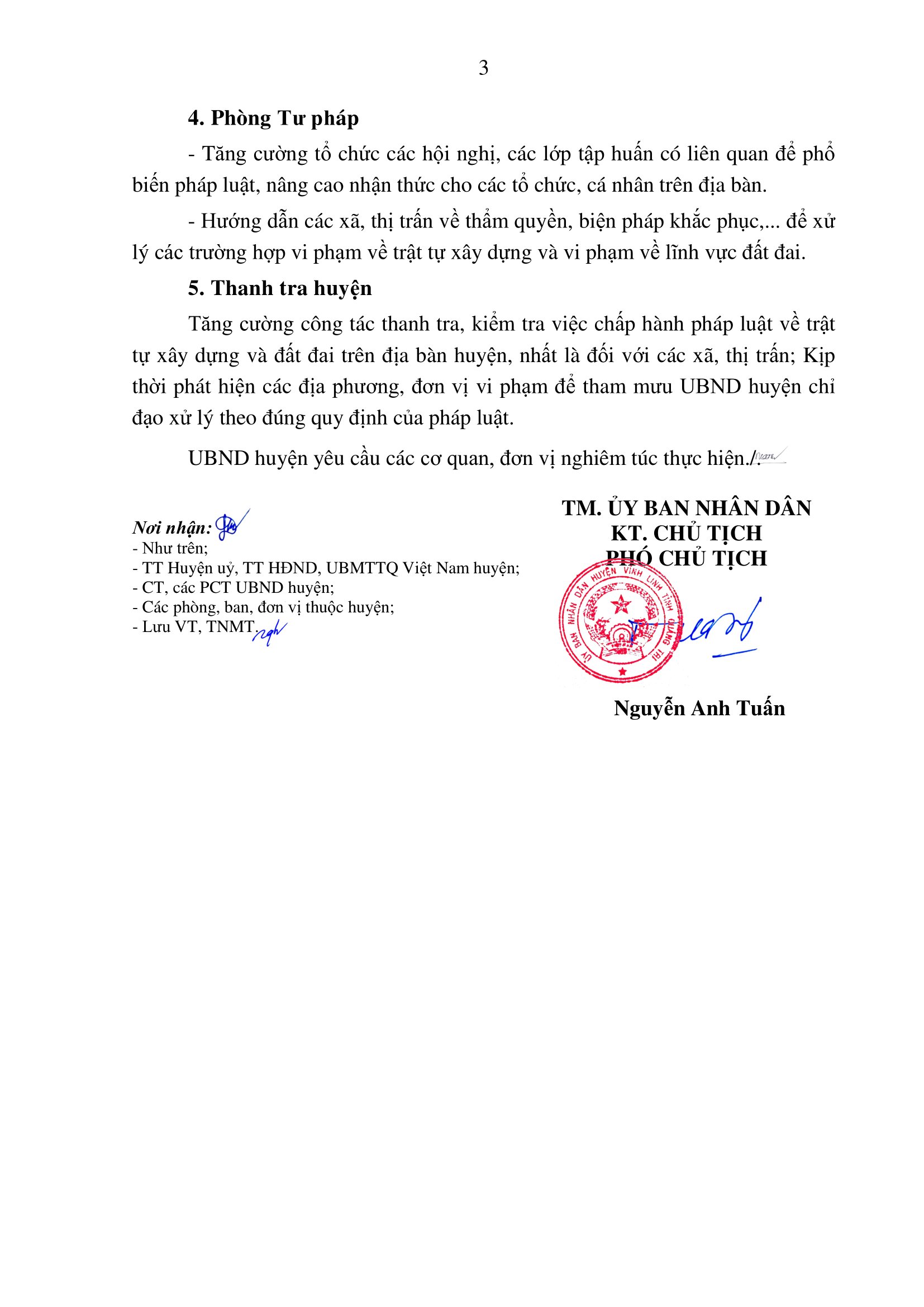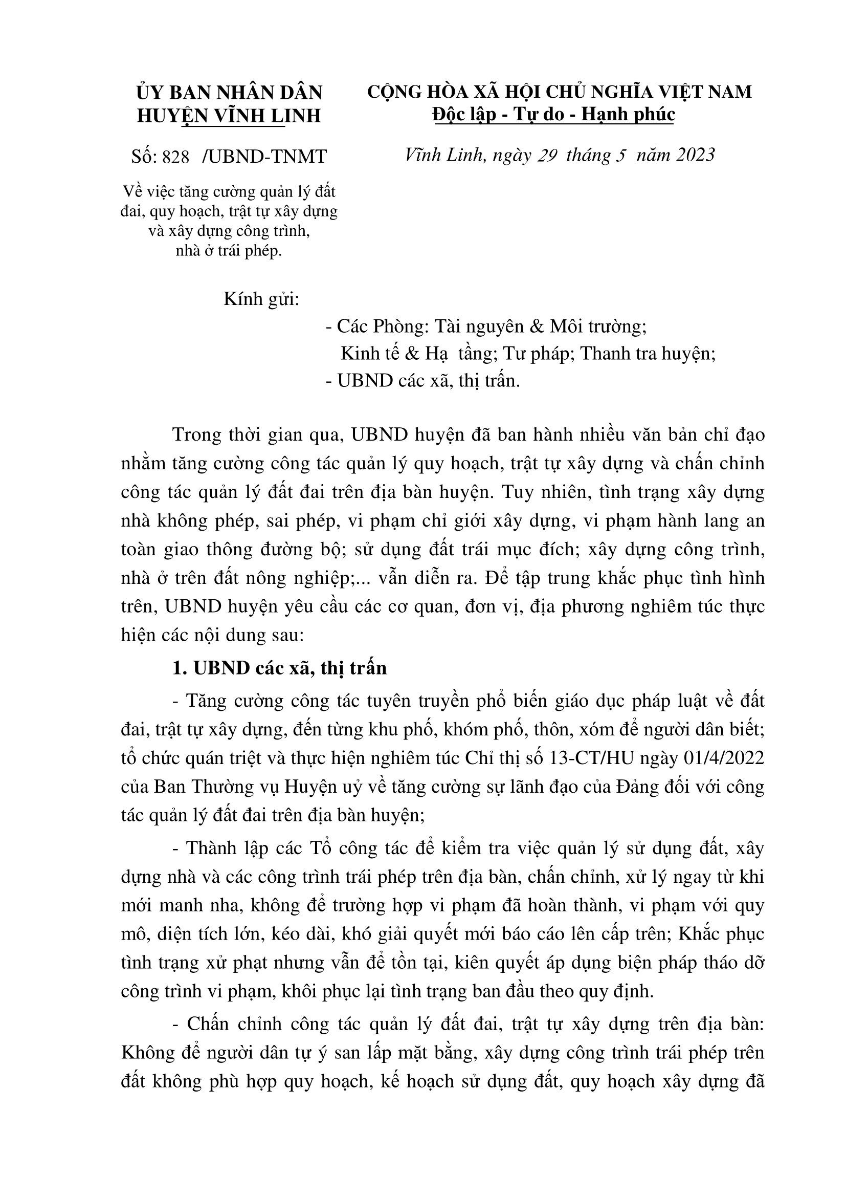 Ngày 29/5/2023, UBND huyện Vĩnh Linh có văn bản chỉ đạo tăng cường quản lý đất đai, quy hoạch, trật tự xây dựng và xây dựng công trình, nhà ở trái phép trên địa bàn.