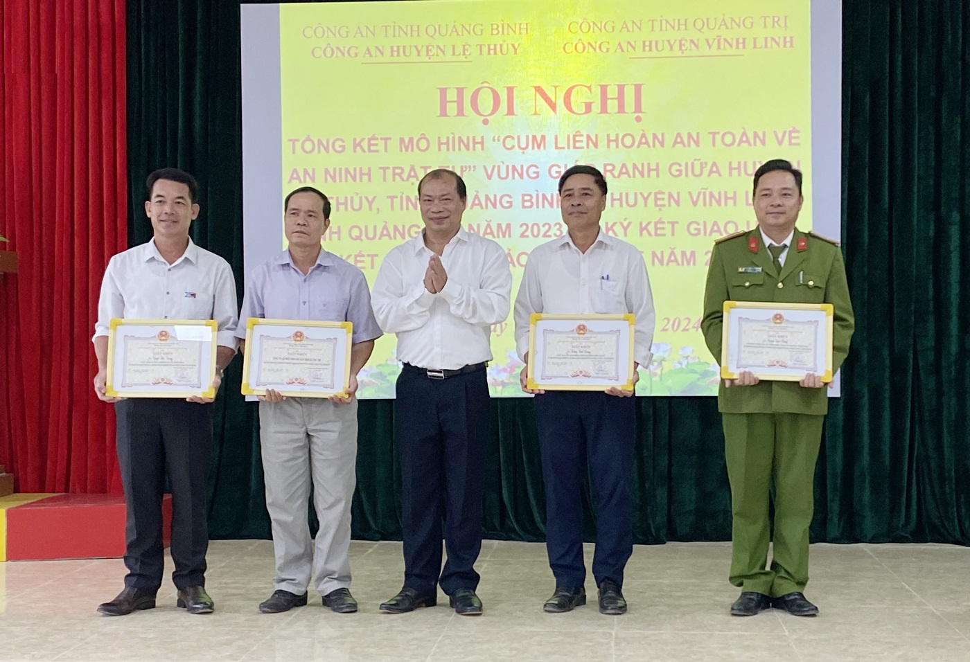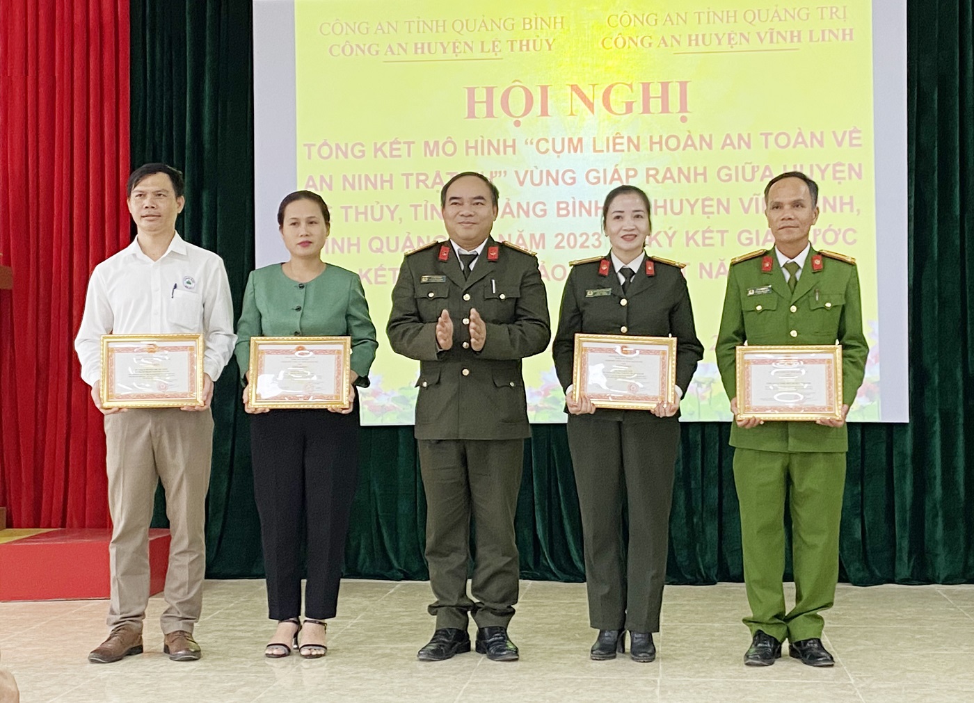 Dịp này, có 2 tập thể và 11 cá nhân được nhận giấy khen của Công an tỉnh Quảng Bình, Quảng Trị, UBND huyện Lệ Thủy, Vĩnh Linh vì đã có thành tích tốt trong thực hiện mô hình “Cụm liên hoàn an toàn về an ninh trật tự” vùng giáp ranh giữa huyện Lệ Thủy và huyện Vĩnh Linh năm 2023.