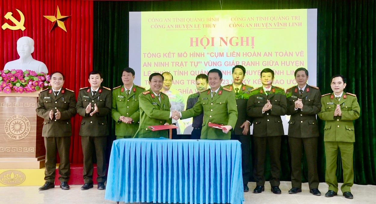 Chiều ngày 11/1/2024, tại Lệ Thủy, tỉnh Quảng Bình, Công an huyện Lệ Thủy phối hợp với Công an huyện Vĩnh Linh, tỉnh Quảng Trị tổ chức hội nghị tổng kết mô hình “Cụm liên hoàn an toàn về an ninh trật tự” vùng giáp ranh giữa huyện Lệ Thủy và huyện Vĩnh Linh năm 2023 và kí kết giao ước kết nghĩa về bảo đảm an ninh trật tự năm 2024. Tham dự có đại diện lãnh đạo Công an tỉnh Quảng Bình, Quảng Trị; có các đồng chí: Phan Hồng Đăng, Phó Bí thư Thường trực huyện ủy Lệ Thủy; Vũ Văn Phong, Chủ tịch UBMT huyện Vĩnh Linh; đại diện lãnh đạo các xã vùng giáp ranh hai huyện.
