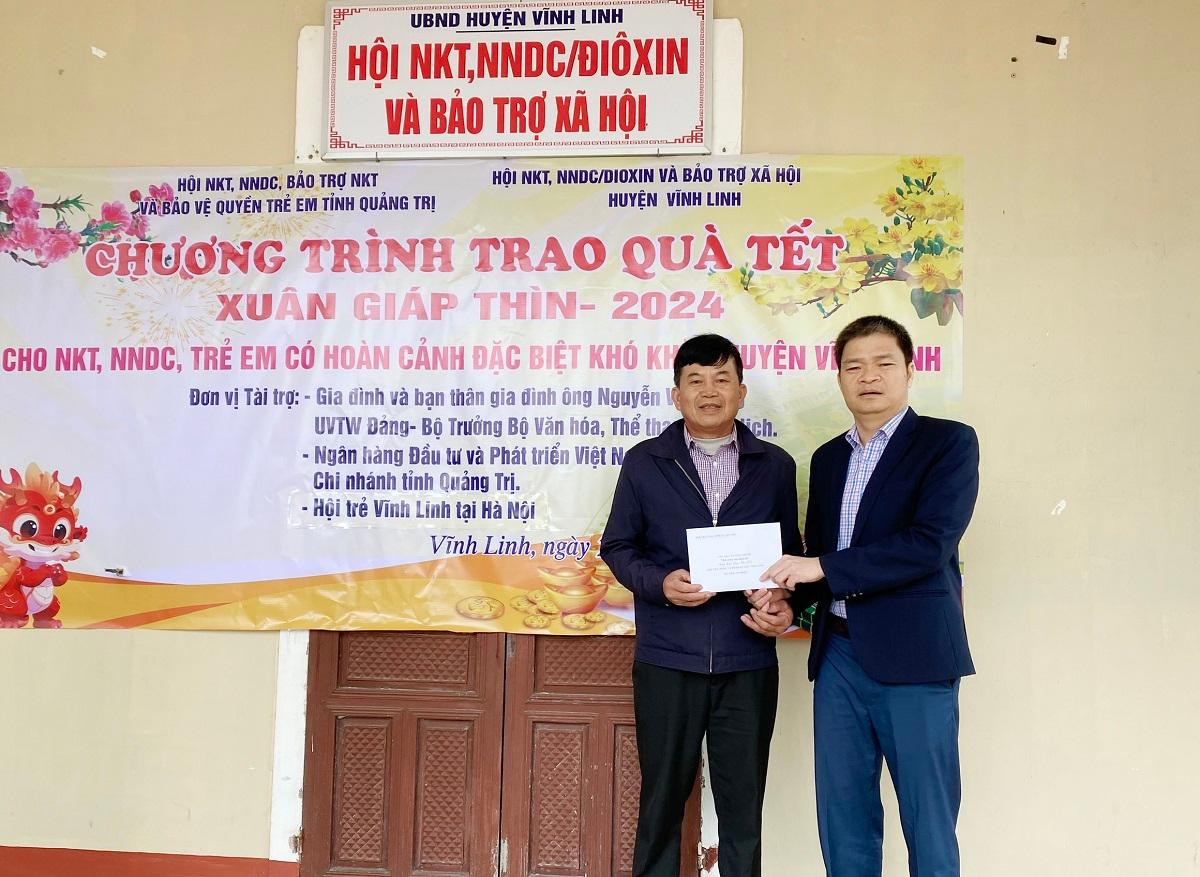 Với tinh thần “không để ai bị bỏ lại phía sau” Hội NKT,NNDC/DIOXIN&BTXH huyện Vĩnh Linh đã trao 192 phần quà với tổng trị giá 192,5 triệu do các tổ chức, cá nhân hảo tâm hỗ trợ, trong đó có 22 phần quà gồm tủ bếp, nồi cơm điện, quạt, bếp ga, gạo trị giá 110 triệu đồng do dự án RENEW hỗ trợ; Hội Trẻ Vĩnh Linh tại Hà Nội hỗ trợ 20 triệu đồng. Đây là hoạt động có ý nghĩa được tổ chức hàng năm để góp phần chia sẻ những khó khăn với những đối tượng kém may mắn nhân dịp Tến đến Xuân về.