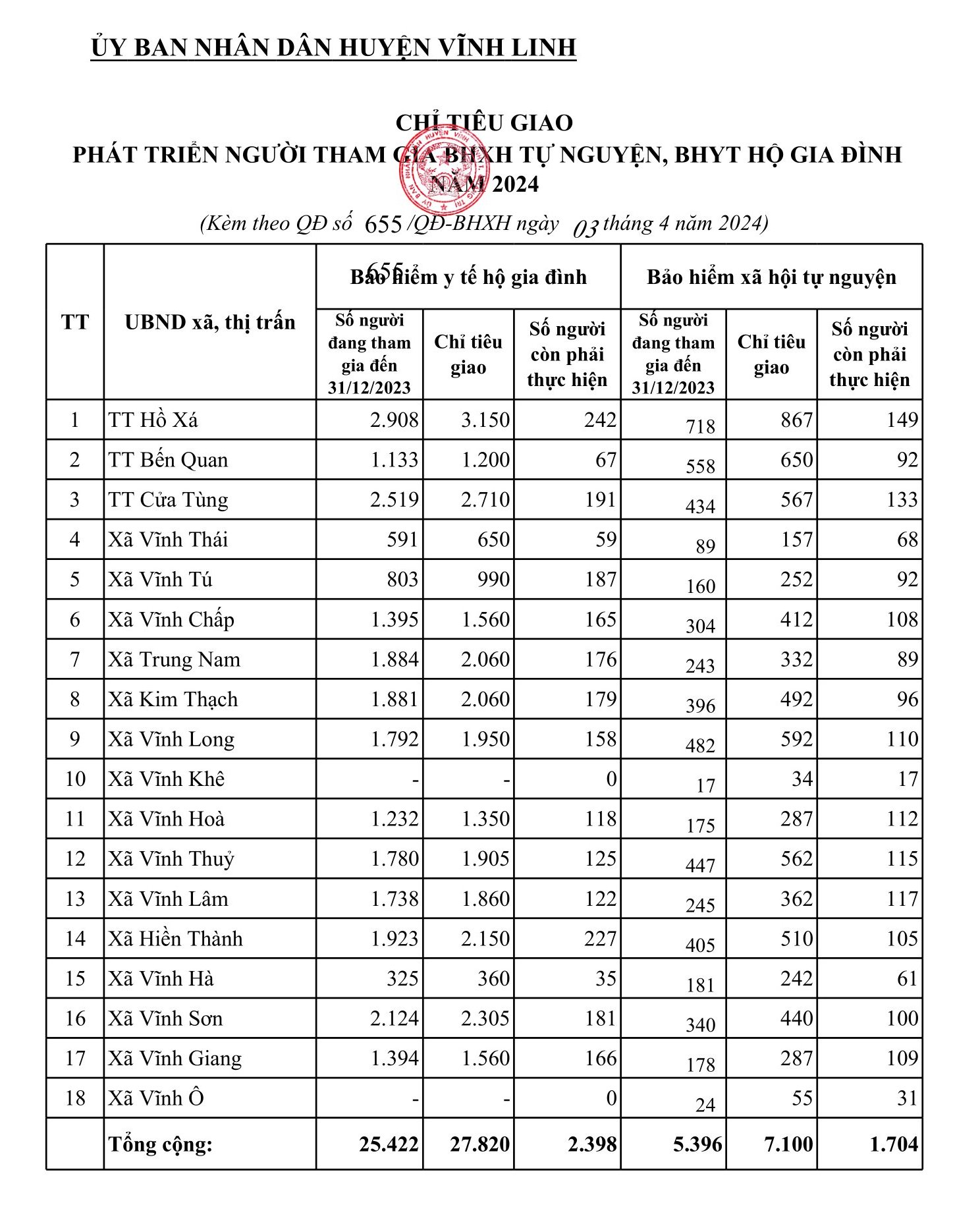 Ngày 03/4/2024, UBND huyện Vĩnh Linh có Quyết định giao chỉ tiêu phát triển số người tham gia Bảo hiểm xã hội tự nguyện, Bảo hiểm Y tế hộ gia đình năm 2024.