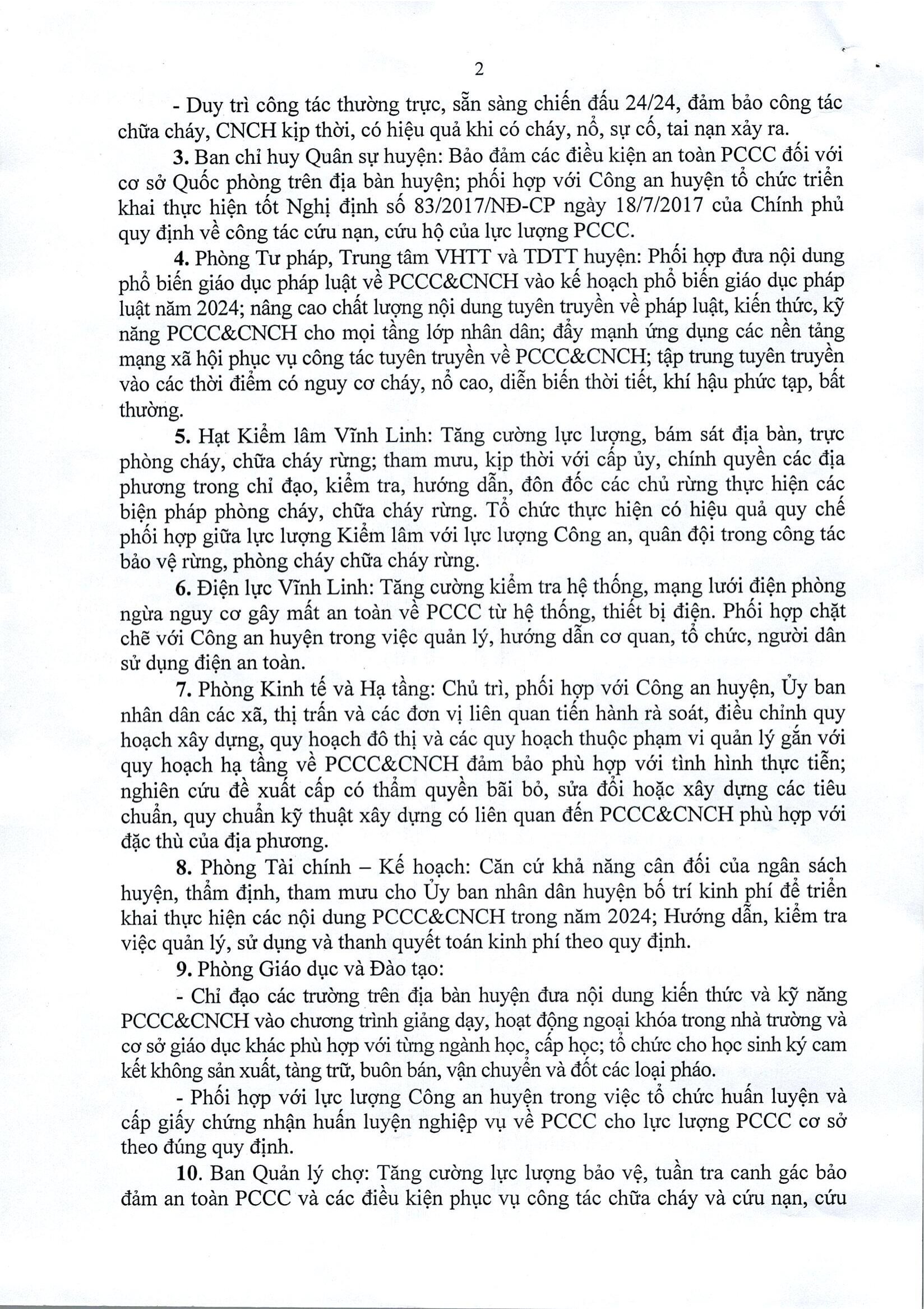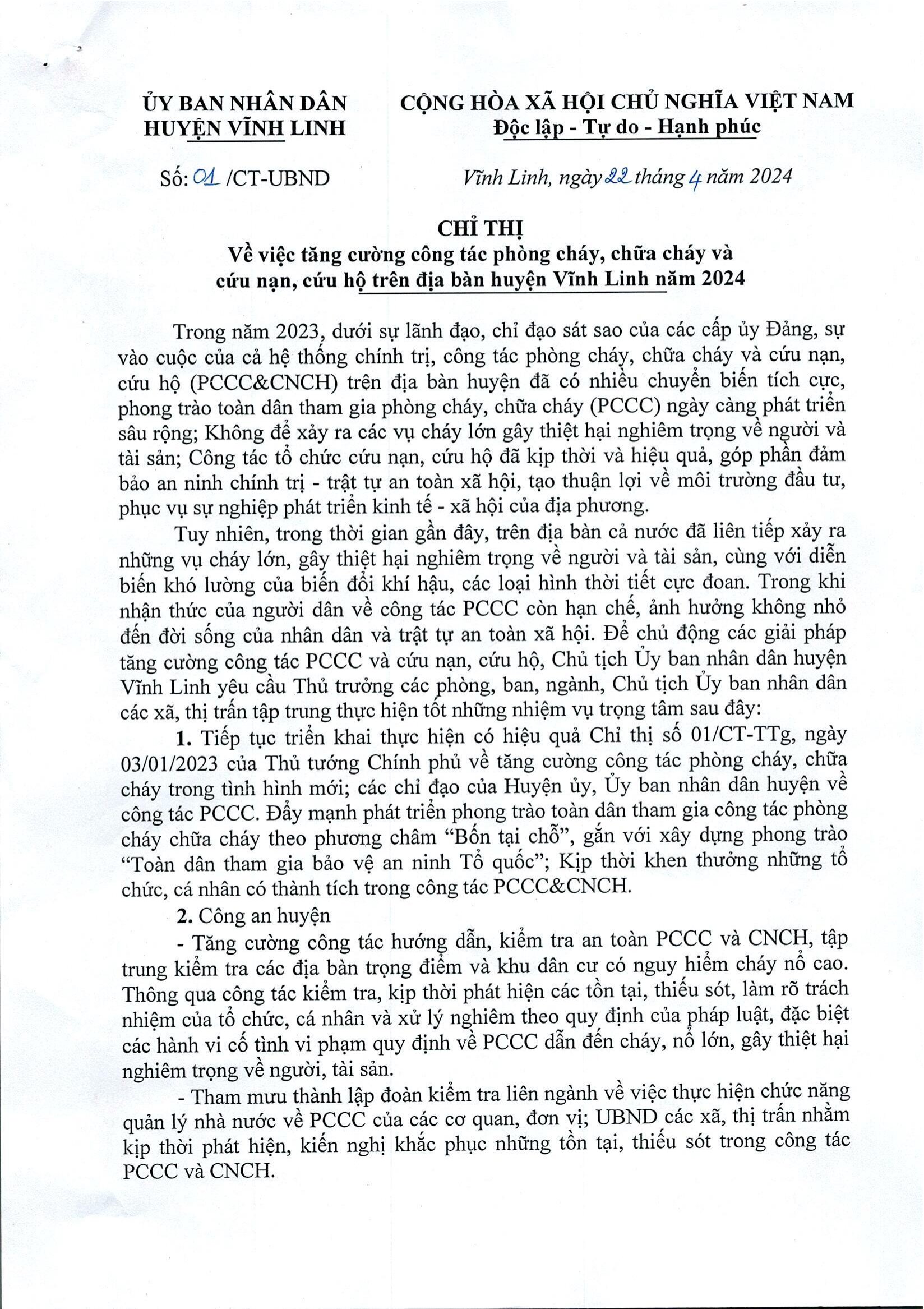 Ngày 22/4/2024, Chủ tịch UBND huyện Vĩnh Linh đã ban hành Chỉ thị số 01/CT-UBND về việc tăng cường công tác phòng cháy, chữa cháy và cứu nạn, cứu hộ trên địa bàn huyện năm 2024.
