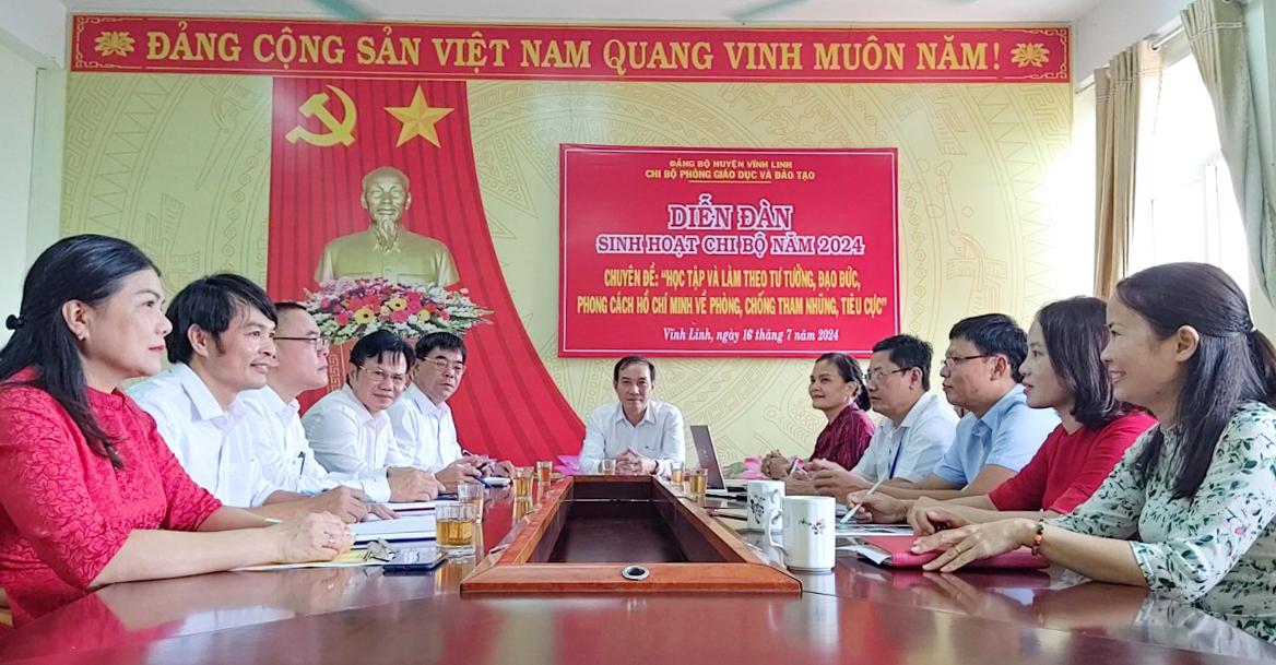 Ngày 16/7/2024, tiếp tục thực hiện Kết luận số 01-KL/TW, ngày 18/5/2021 của Bộ Chính trị; Chuyên đề toàn khóa Đại hội XIII (2021- 2025) về học tập và làm theo tư tưởng, đạo đức, phong cách Hồ Chí Minh; Chi bộ Phòng GD&ĐT huyện Vĩnh Linh tổ chức Diễn đàn sinh hoạt chi bộ lần thứ 2, năm 2024 với Chuyên đề “Học tập và làm theo tư tưởng, đạo đức, phong cách Hồ Chí Minh về phòng, chống tham nhũng, tiêu cực”. Tham dự có đồng chí Trần Thị Thu Hà - Uỷ viên BTV, Trưởng Ban Tuyên Giáo Huyện uỷ.