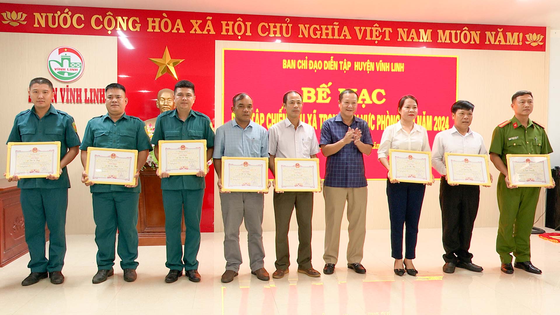 Ngày 10/9/2024, Ban Chỉ đạo diễn tập huyện Vĩnh Linh tổ chức bế mạc diễn tập chiến đấu cấp xã trong khu vực phòng thủ năm 2024. Đến dự có các đồng chí: Trần Nhật Quang Bí thư Huyện ủy; Nguyễn Thị Hương- Phó Bí thư Thường trực Huyện ủy, Chủ tịch HĐND huyện; Thái Văn Thành- Chủ tịch UBND huyện.