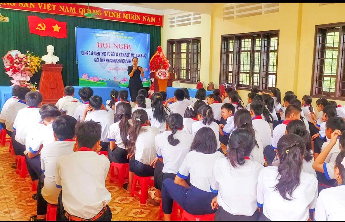 Cung cấp kiến thức về giới và kiểm soát mất cân bằng giới khi sinh cho học sinh ở xã Hiền Thành -Ảnh: DSVL
