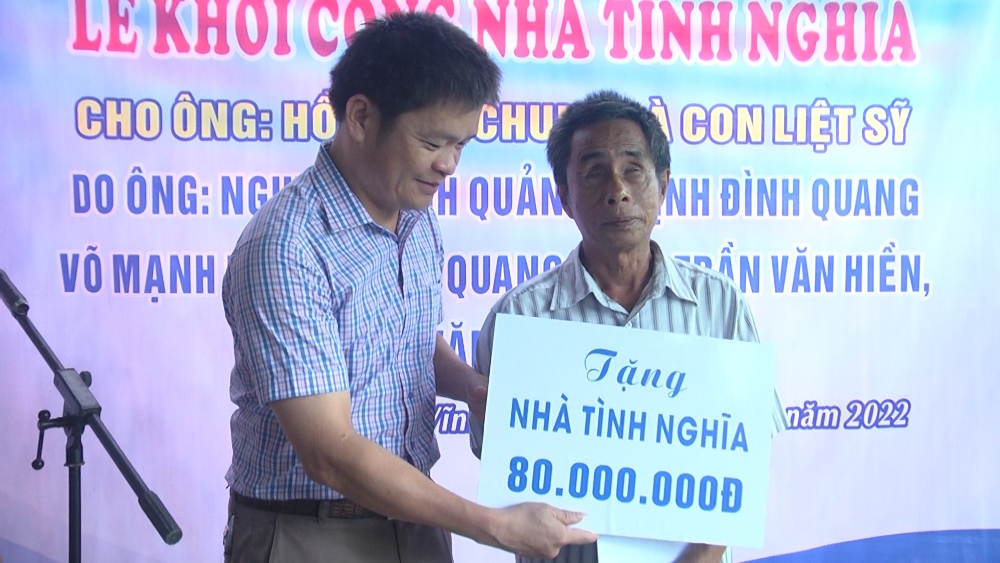 Cùng với hộ ông Hồ Ngọc Chung, trong đợt này, còn có thêm 3 hộ thuộc đối tượng người có công, thân nhân người có công ở các xã Vĩnh Chấp, Trung Nam, Vĩnh Thái được nhận hỗ trợ xây dựng nhà tình nghĩa với số tiền 80 triệu đồng/nhà. Toàn bộ kinh phí xây dựng cả 4 ngôi nhà tình nghĩa này do 5 cá nhân gồm: Nguyễn Đình Quảng, Trịnh Đình Quân, Võ Mạnh Hùng, Trần Quang Hiếu, Trần Văn Hoàn, là con em Vĩnh Linh hiện đang sinh sống, công tác tại thị xã Phú Mỹ, tỉnh Bà Rịa- Vũng Tàu tài trợ thông qua sự kết nối, vận động của UBND huyện Vĩnh Linh.