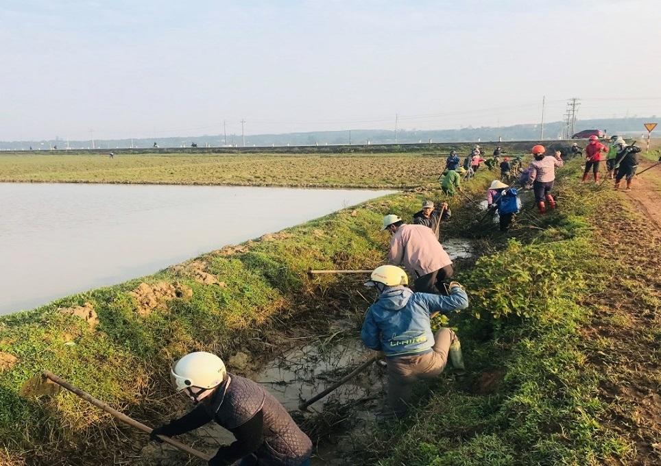 Xã viên HTX Hiền Dũng, xã Vĩnh Hòa ra quân làm thủy lợi, vệ sinh đồng ruộng.