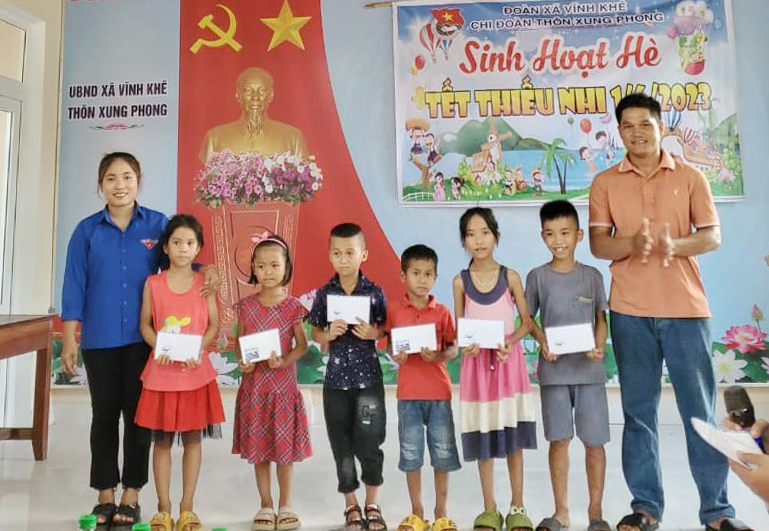 Xã đoàn Vĩnh Khê tổ chức trao quà cho các em ở bản Xung Phong.