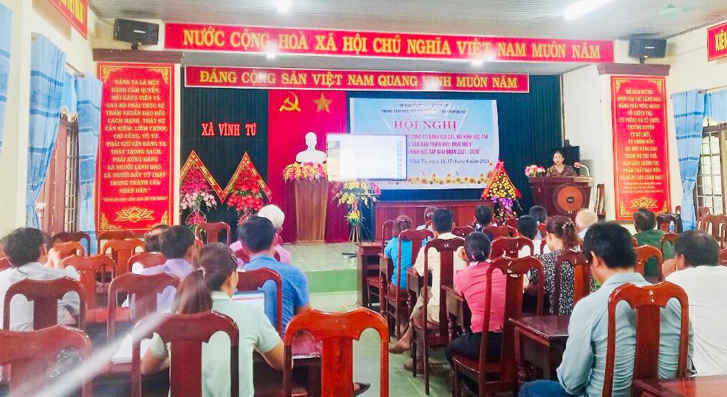 Ngày 16/6/2023, xã Vĩnh Tú tổ chức tập huấn các nội dung nhằm triển khai thực hiện có hiệu quả Chương trình “Xây dựng mô hình công dân học tập giai đoạn 2021-2030” và đẩy mạnh tuyên truyền, nâng cao nhận thức về tầm quan trọng của việc thực hiện mô hình “Công dân học tập” nhằm thúc đẩy học tập suốt đời, xây dựng xã hội học tập, góp phần nâng cao chất lượng nguồn nhân lực đáp ứng yêu cầu phát triển của cộng đồng, cơ quan, tổ chức, đơn vị trên địa bàn.