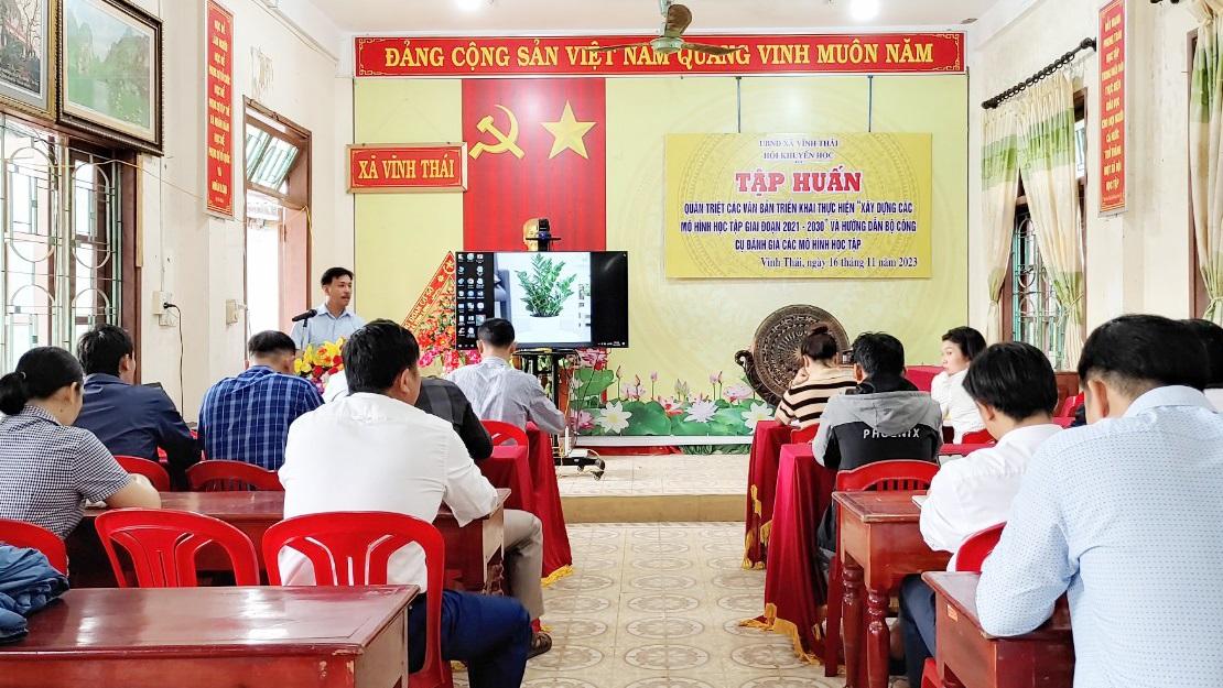 Ngày 16/11/2023, xã Vĩnh Thái tổ chức tập huấn các nội dung nhằm triển khai thực hiện có hiệu quả Chương trình “Xây dựng mô hình công dân học tập giai đoạn 2021-2030” theo Quyết định 677/QĐ-TTg ngày 03/6/2022 của Thủ tướng Chính phủ và Chương trình “Đẩy mạnh phong trào học tập suốt đời trong gia đình, dòng họ, cộng đồng, đơn vị giai đoạn 2021- 2030” theo Quyết định 387/QĐ-TTg ngày 25/3/2022 của Thủ tướng Chính phủ nhằm khuyến khích, tạo cơ hội công bằng, điều kiện thuận lợi cho mọi cá nhân trong tổ chức, đơn vị, gia đình, mọi công dân trong xã hội được tham gia học tập, hướng tới công dân số đáp ứng yêu cầu của chương trình chuyển đổi số quốc gia và góp phần xây dựng thành công xã hội học tập.