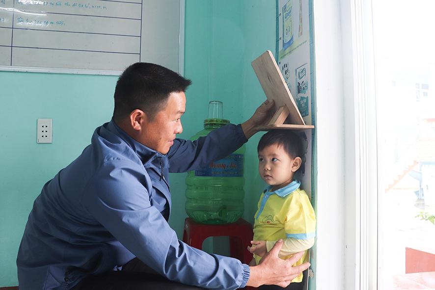 Công việc hằng ngày của anh Bảy là chăm sóc sức khỏe cho trẻ tại Trường Mầm non Vĩnh Thái - Ảnh: T.P