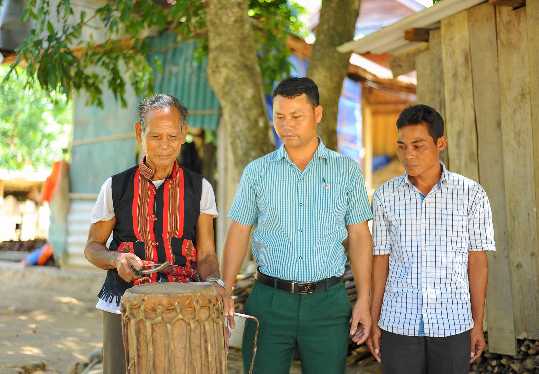 Anh Hồ Văn Tuân (đứng giữa) có nhiều đóng góp trong việc bảo tồn, phát huy văn hóa cồng chiêng ở xã Vĩnh Ô -Ảnh: TRẦN TUYỀN