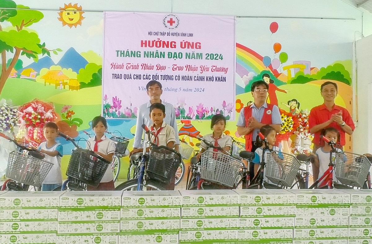Tại chương trình, Hội CTĐ huyện Vĩnh Linh đã trao tặng 15 chiếc xe đạp cho 15 em học sinh có hoàn cảnh khó khăn, 258 thùng sữa Đà Lạt True milk và 2.000 bộ quần áo củ được quyên tặng thông qua “Tủ hàng nhân ái” của Hội CTĐ huyện. Tổng giá trị các phần quà là trên 97 triệu đồng. Được biết, các phần quà ý nghĩa này có sự đồng hành tài trợ của Hiệp hội Doanh nghiệp tỉnh Quảng Trị và Công ty Sữa VPMilk Đà Lạt.