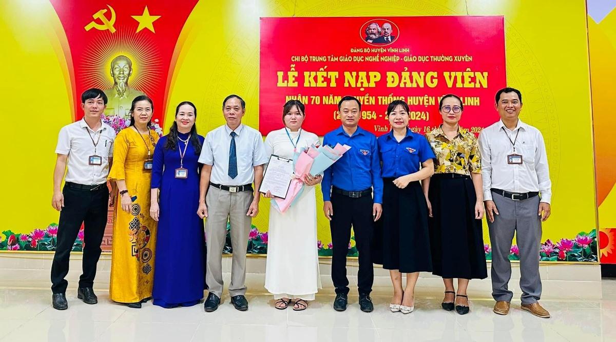 Nhân kỷ niệm 134 năm ngày sinh Chủ tịch Hồ Chí Minh (19/5/1890- 19/5/2024) và hướng tới chào mừng kỷ niệm 70 năm truyền thống Vĩnh Linh (25/8/1954- 25/8/2024), ngày 16/5, Chi bộ Trung tâm GDNN-GDTX huyện Vĩnh Linh đã tổ chức lễ kết nạp đảng viên mới cho học sinh có thành tích xuất sắc trong quá trình học tập và rèn luyện. Tham dự có đồng chí Nguyễn Quốc Toản- Phó Bí thư Tỉnh đoàn, Nguyễn Thanh Toàn- Trưởng Ban Tổ chức Huyện uỷ Vĩnh Linh.
