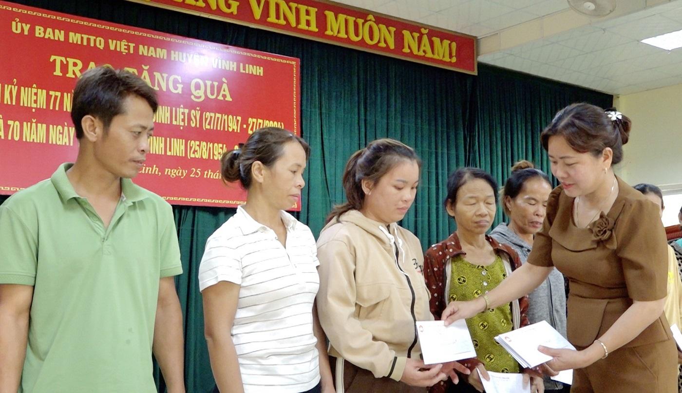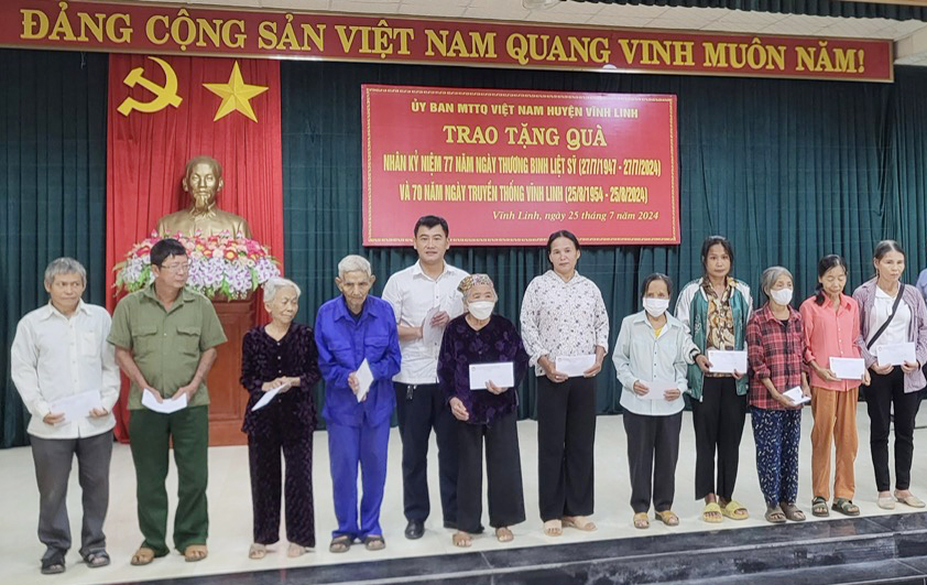 Nhân dịp kỷ niệm 77 năm Ngày Thương binh - Liệt sĩ 27/7 (1947 - 2024); kỷ niệm 70 năm truyền thống Vĩnh Linh 25/8 (1954 - 2024), chiều ngày 25/7, Ủy ban Mặt trận Tổ quốc Việt Nam huyện Vĩnh Linh tổ chức chương trình trao tặng 200 suất quà, mỗi suất trị giá 1 triệu đồng cho 200 gia đình chính sách, hộ hoàn cảnh khó khăn trên địa bàn. Tham dự có các đồng chí: Nguyễn Thị Hương - Phó Bí thư Thường trực Huyện ủy, Chủ tịch HĐND huyện; Phan Ngọc Khoa - Chủ tịch UBMTTQVN huyện.