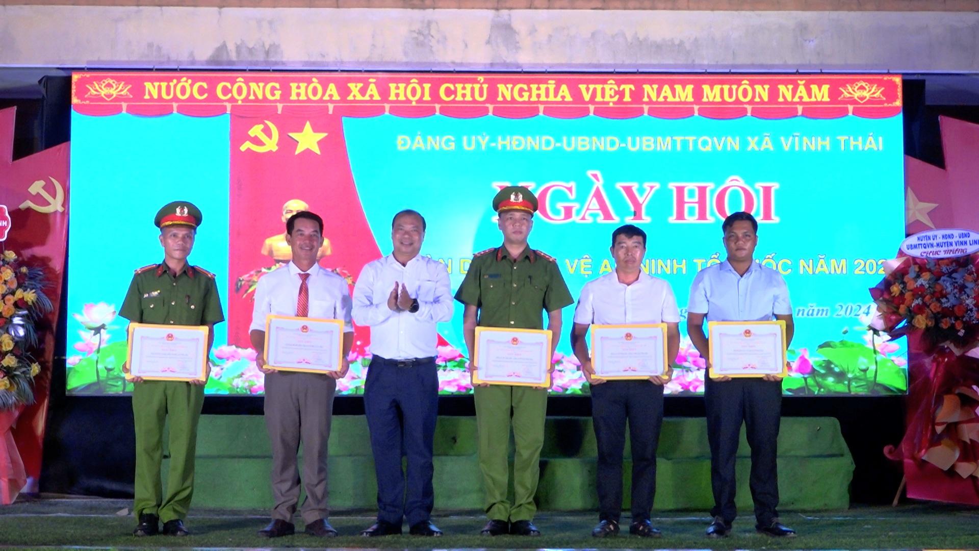 Nhân dịp này, huyện Vĩnh Linh và xã Vĩnh Thái biểu dương, khen thưởng cho các tập thể, cá nhân đạt thành tích xuất sắc trong phong trào toàn dân bảo vệ ANTQ; ký kết giao ước thi đua; trao hỗ trợ cho gia đình chính sách gặp hoàn cảnh khó khăn trên địa bàn.