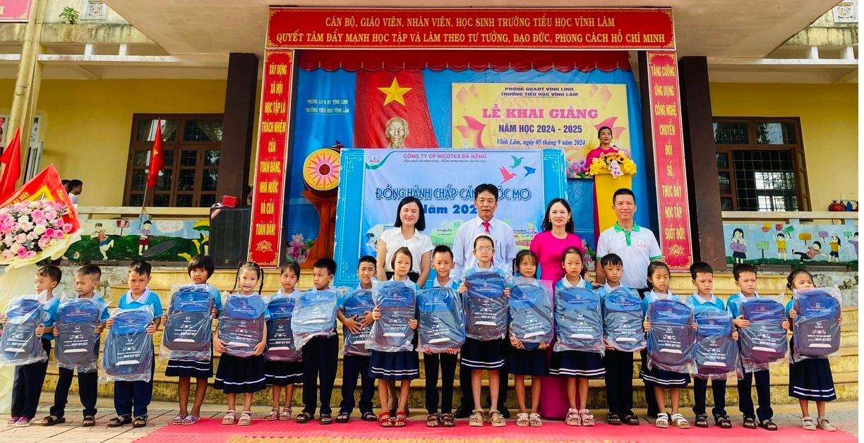 Nhân dịp năm học mới 2024- 2025, Công ty Cổ phần Nicotex Đà Nẵng đã có nhiều hoạt động ý nghĩa, trong đó có việc trao tặng 210 suất quà là balo đi học trị giá 200 nghìn đồng/chiếc cho học sinh các trường Tiểu học xã Vĩnh Lâm, Vĩnh Long và Vĩnh Thủy của huyện Vĩnh Linh. Đây là hoạt động thiện nguyện thường xuyên của Công ty dành sự động viên khích lệ cho các em nhỏ có hoàn cảnh khó khăn, vươn lên có kết quả học tập tốt.