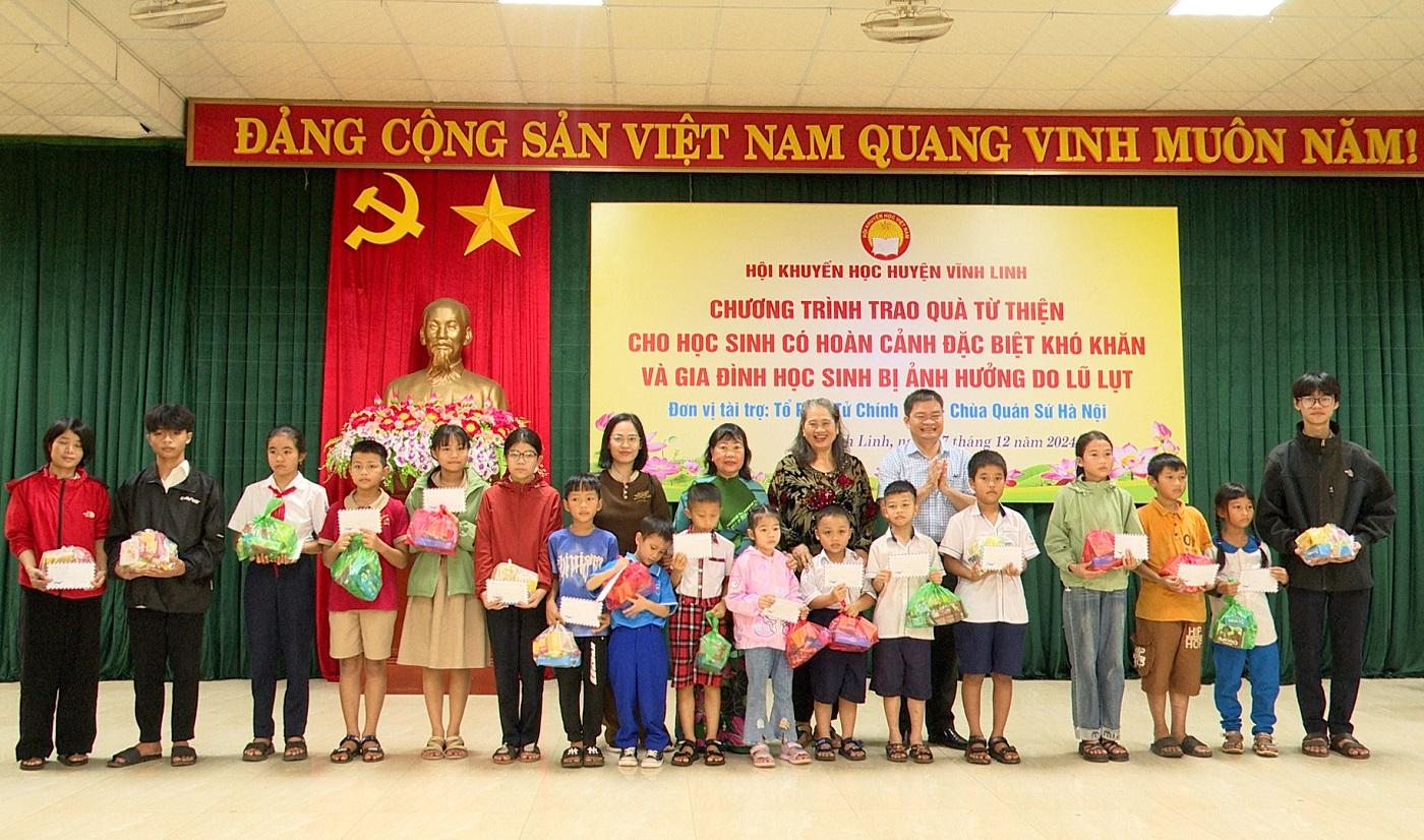 Ngày 7/12/2024, Hội Khuyến học huyện Vĩnh Linh tổ chức chương trình trao 169 suất học bổng và quà từ nguồn hỗ trợ của Tổ Phật tử Chính Tâm - Chùa Quán Sứ Hà Nội đến học sinh hoàn cảnh khó khăn trên địa bàn.