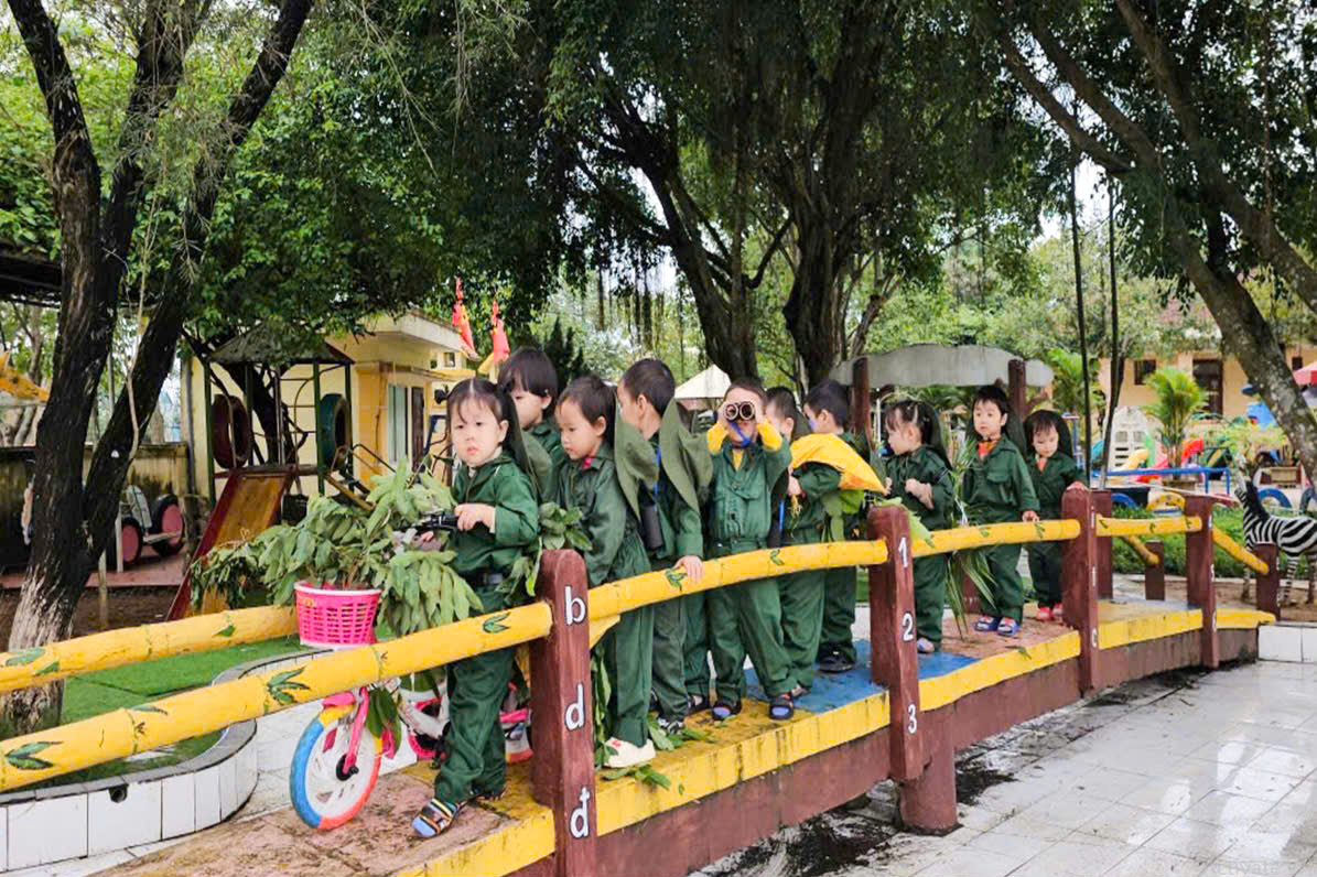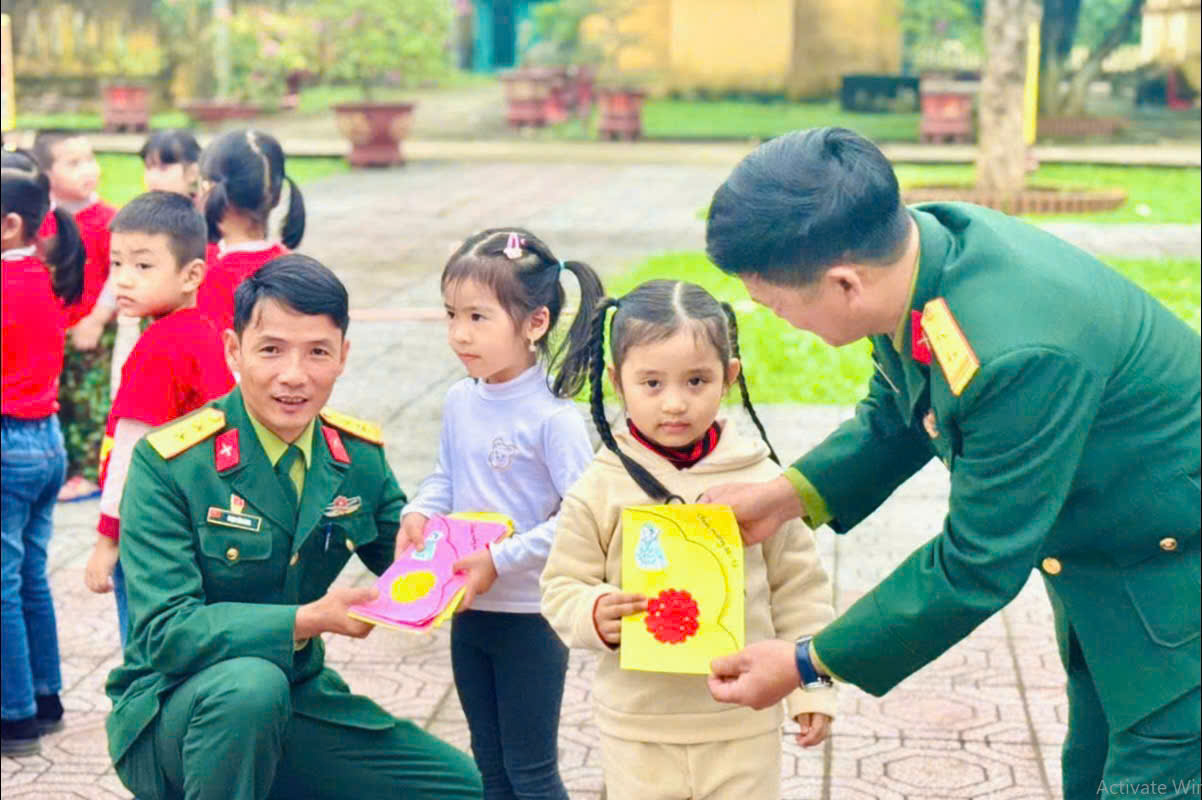 Nhà trường phối hợp với Ban Chỉ huy Quân sự huyện Vĩnh Linh tổ chức buổi giao lưu để các bé có cơ hội gặp gỡ, trò chuyện và tham quan doanh trại. Tại đây, các bé được khám phá các trang thiết bị, dụng cụ của các chú bộ đội và thể hiện lòng yêu mến qua các nghi thức chào hỏi, lời chúc thân thương, cùng những tấm thiệp do chính tay các bé làm. Các tiết mục biểu diễn đồng diễn như bài hát "Đường lên phía trước" hay "Chú bộ đội" được các bé thể hiện với tinh thần sôi động và đáng yêu.