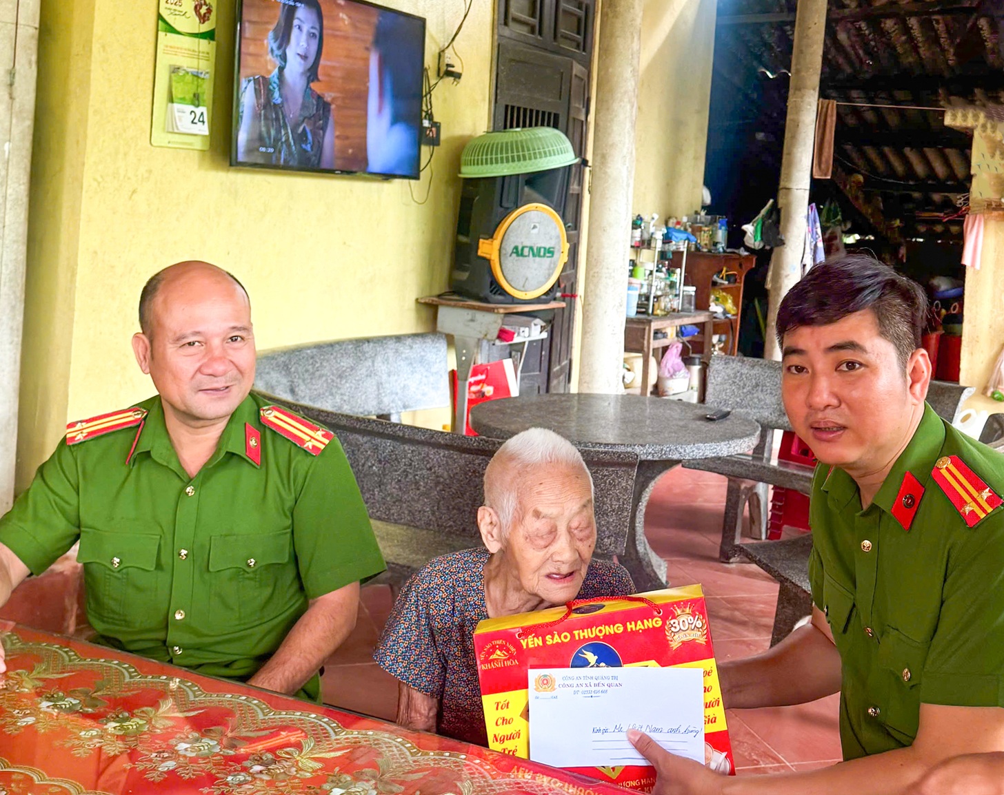 Tiếp đó, Công an xã Bến Quan đã đến thăm hỏi, tặng quà Mẹ Việt Nam anh hùng Lê Thị Lựu tại Khóm 4. Tại đây, cán bộ chiến sĩ đã ân cần thăm hỏi sức khỏe, đời sống của Mẹ và bày tỏ sự tri ân sâu sắc trước những đóng góp to lớn của Mẹ trong sự nghiệp cách mạng.