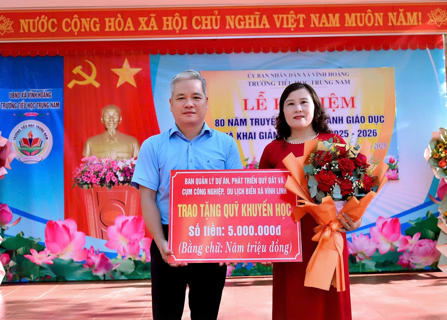 Nhân dịp này, UBND xã Vĩnh Hoàng, Trường Tiểu học Trung Nam đã trao tặng các phần quà cho các em học sinh có hoàn cảnh khó khăn. Đồng thời tiếp nhận, cắt băng khánh thành dãy nhà 6 phòng học được Ngân hàng BIDV Quảng Trị tài trợ xây dựng với số tiền 5 tỷ đồng; tiếp nhận phần quà khuyến học 5 triệu đồng từ Ban Quản lý dự án, Phát triển quỹ đất và Cụm công nghiệp, Du lịch biển xã Vĩnh Linh.
