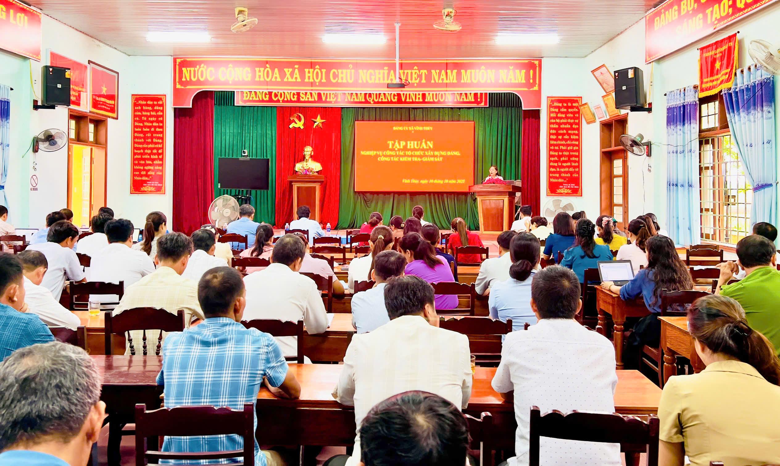 Thực hiện Chương trình công tác toàn khóa nhiệm kỳ 2025- 2030 và Chương trình công tác năm 2025, ngày 10/10/2025, Đảng ủy xã Vĩnh Thủy tổ chức lớp tập huấn nghiệp vụ công tác Tổ chức xây dựng Đảng và công tác Kiểm tra, giám sát năm 2025.