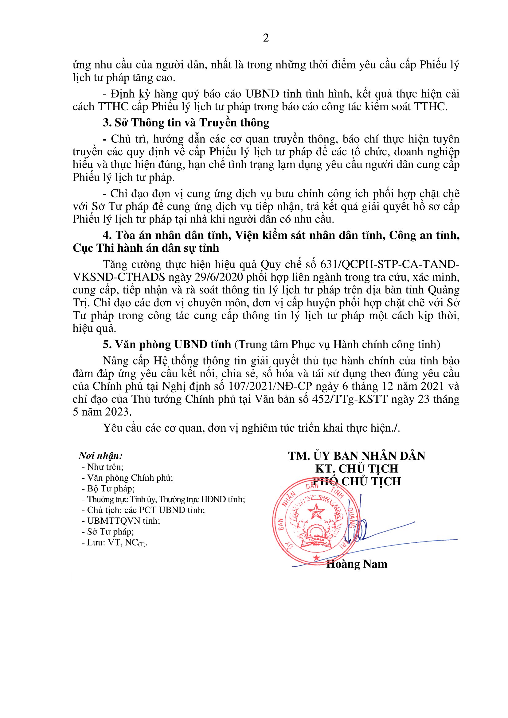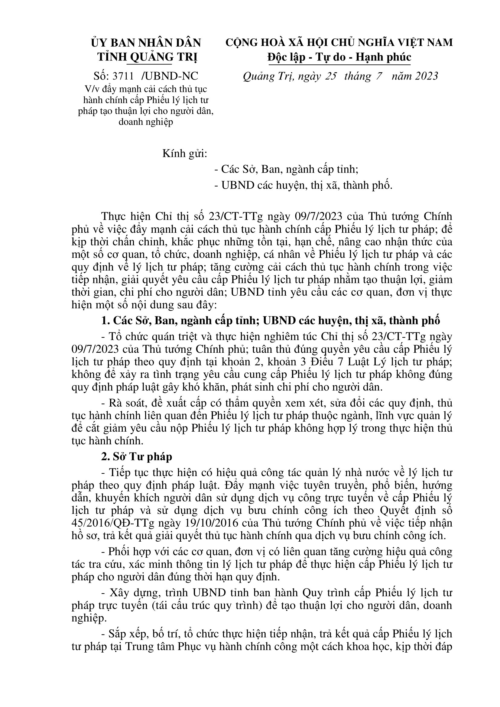 Thực hiện Chỉ thị số 23/CT-TTg ngày 09/7/2023 của Thủ tướng Chính phủ về việc đẩy mạnh cải cách thủ tục hành chính cấp Phiếu lý lịch tư pháp; để kịp thời chấn chỉnh, khắc phục những tồn tại, hạn chế, nâng cao nhận thức của một số cơ quan, tổ chức, doanh nghiệp, cá nhân về Phiếu lý lịch tư pháp và các quy định về lý lịch tư pháp; tăng cường cải cách thủ tục hành chính trong việc tiếp nhận, giải quyết yêu cầu cấp Phiếu lý lịch tư pháp nhằm tạo thuận lợi, giảm thời gian, chi phí cho người dân, vừa qua, UBND tỉnh Quảng Trị có văn bản yêu cầu các cơ quan, đơn vị đẩy mạnh cải cách thủ tục hành chính cấp Phiếu lý lịch tư pháp tạo thuận lợi cho người dân, doanh nghiệp.