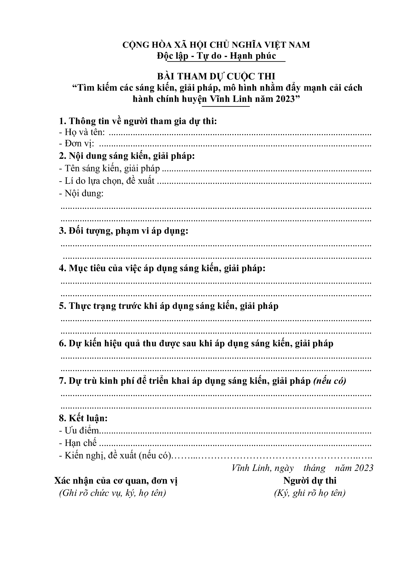 Mẫu bài thi: “Tìm kiếm các sáng kiến, giải pháp, mô hình nhằm đẩy mạnh cải cách hành chính huyện Vĩnh Linh năm 2023”