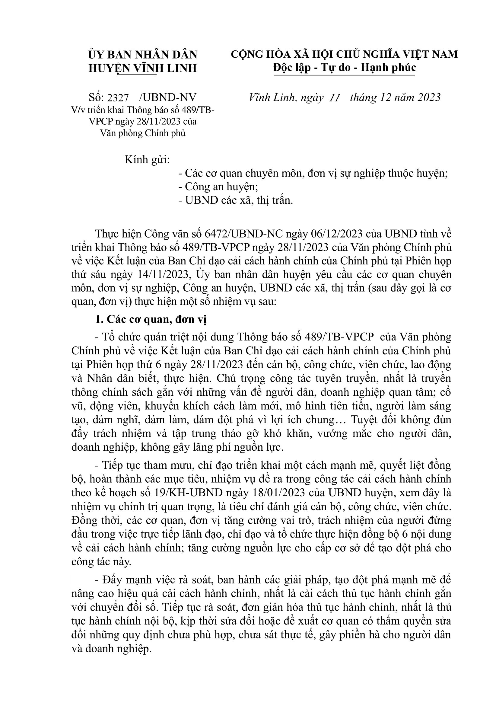 Ngày 11/12/2023, UBND huyện Vĩnh Linh có văn bản chỉ đạo thực hiện Công văn số 6472/UBND-NC ngày 06/12/2023 của UBND tỉnh về triển khai Thông báo số 489/TB-VPCP ngày 28/11/2023 của Văn phòng Chính phủ về việc Kết luận của Ban Chỉ đạo cải cách hành chính của Chính phủ tại Phiên họp thứ sáu ngày 14/11/2023.