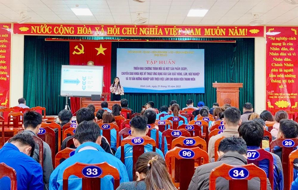 Ngày 21/10/2022, Huyện đoàn- Hội LHTN huyện Vĩnh Linh phối hợp với Phòng Nông nghiệp và Phát triển nông thôn, Phòng Lao động- Thương binh và Xã hội huyện, Công ty May xuất khẩu Scavi Quảng Trị, Công ty Cổ phần nhân lực Quốc tế Việt tổ chức tập huấn triển khai Chương trình mỗi xã một sản phẩm- OCOP, chuyển giao khoa học kỹ thuật ứng dụng vào sản xuất nông, lâm, ngư nghiệp và tư vấn hướng nghiệp giới thiệu việc làm cho đoàn viên, thanh niên trên địa bàn.