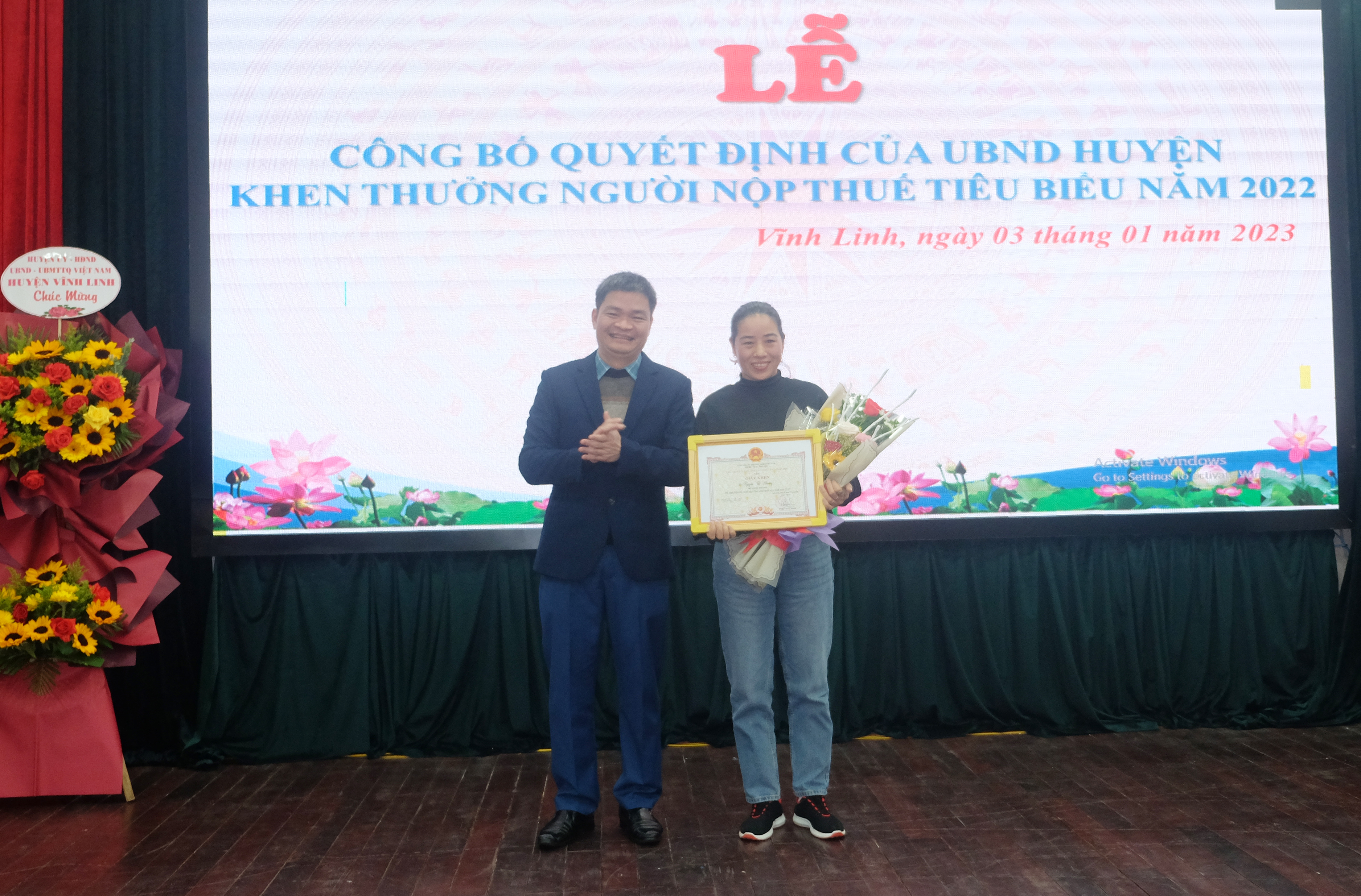 Chiều ngày 3/1/2023, UBND huyện Vĩnh Linh tổ chức hội nghị triển khai nhiệm vụ công tác thuế năm 2023 và biểu dương người nộp thuế tiêu biểu năm 2022. Đến dự có các đồng chí: Trần Nhật Quang- Bí thư Huyện ủy, Nguyễn Quang Úy- Phó Cục trưởng Cục Thuế Quảng Trị, Vũ Văn Phong- Trưởng Ban Dân vận Huyện ủy, Chủ tịch UBMT huyện, Hoàng Hà- Phó Chủ tịch HĐND huyện, Nguyễn Thiên Tùng- Phó Chủ tịch UBND huyện.