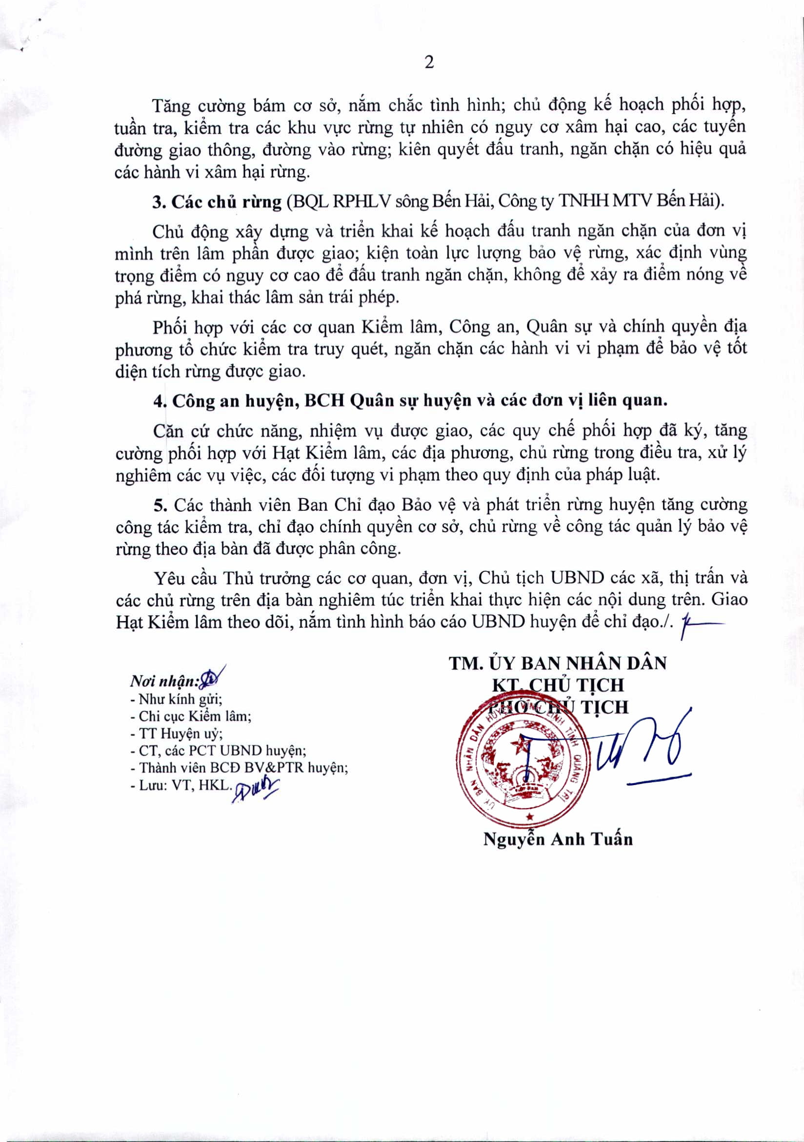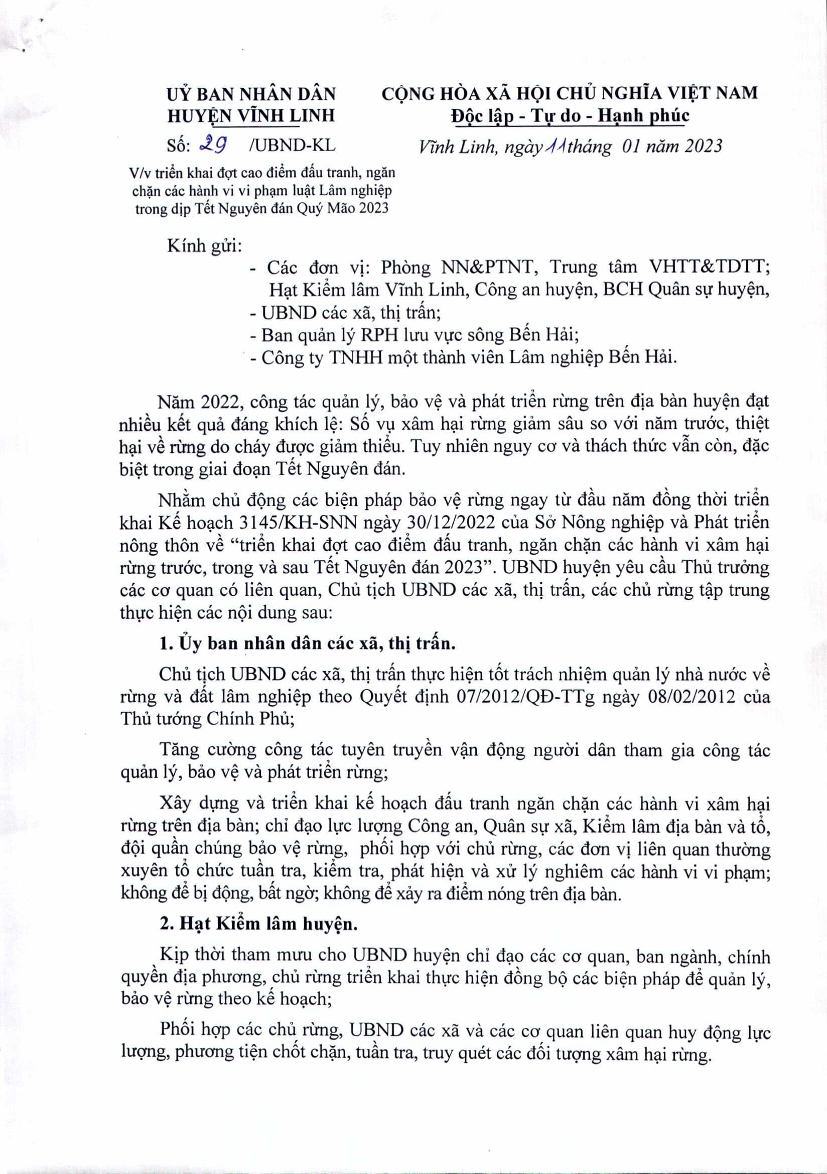 Ngày 11/1/2023, UBND huyện Vĩnh Linh có văn văn bản chỉ đạo các ban ngành liên quan và UBND các xã, thị trấn triển khai đợt cao điểm đấu tranh ngăn chặn các hành vi vi phạm Luật Lâm nghiệp trong dịp Tết Nguyên đán Quý Mão 2023.