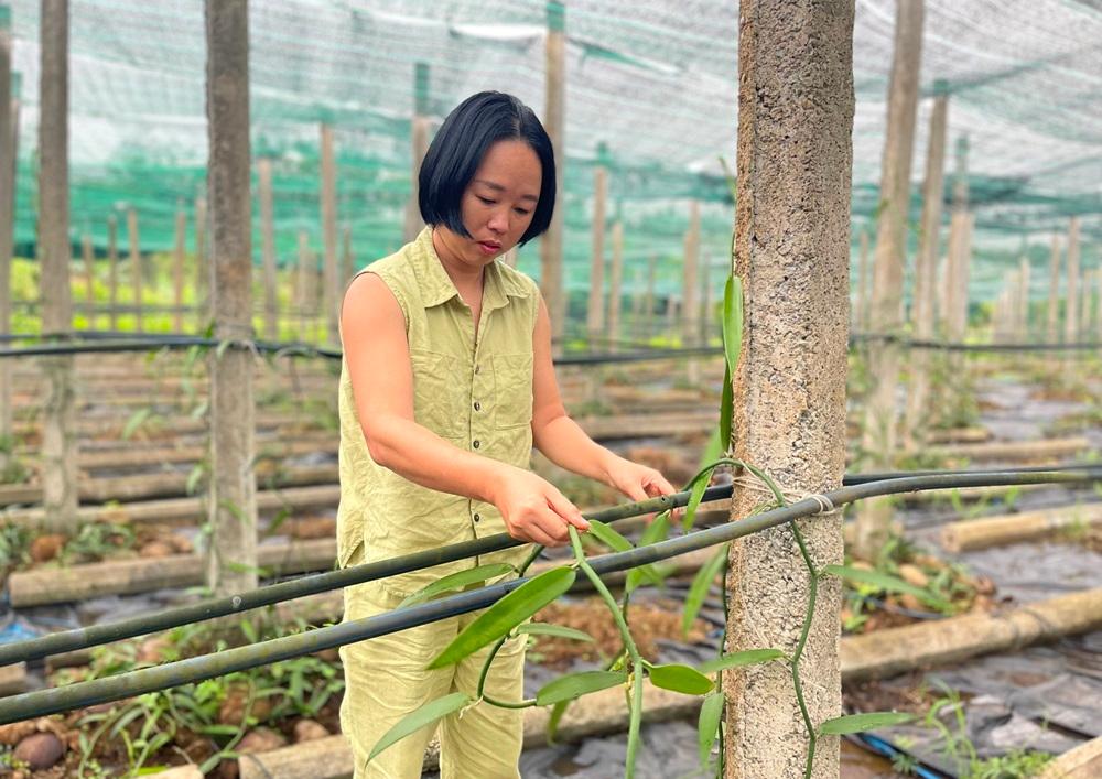 Chị Võ Thị Liên theo dõi sát sao quá trình phát triển của cây Vanilla tại xã Kim Thạch.