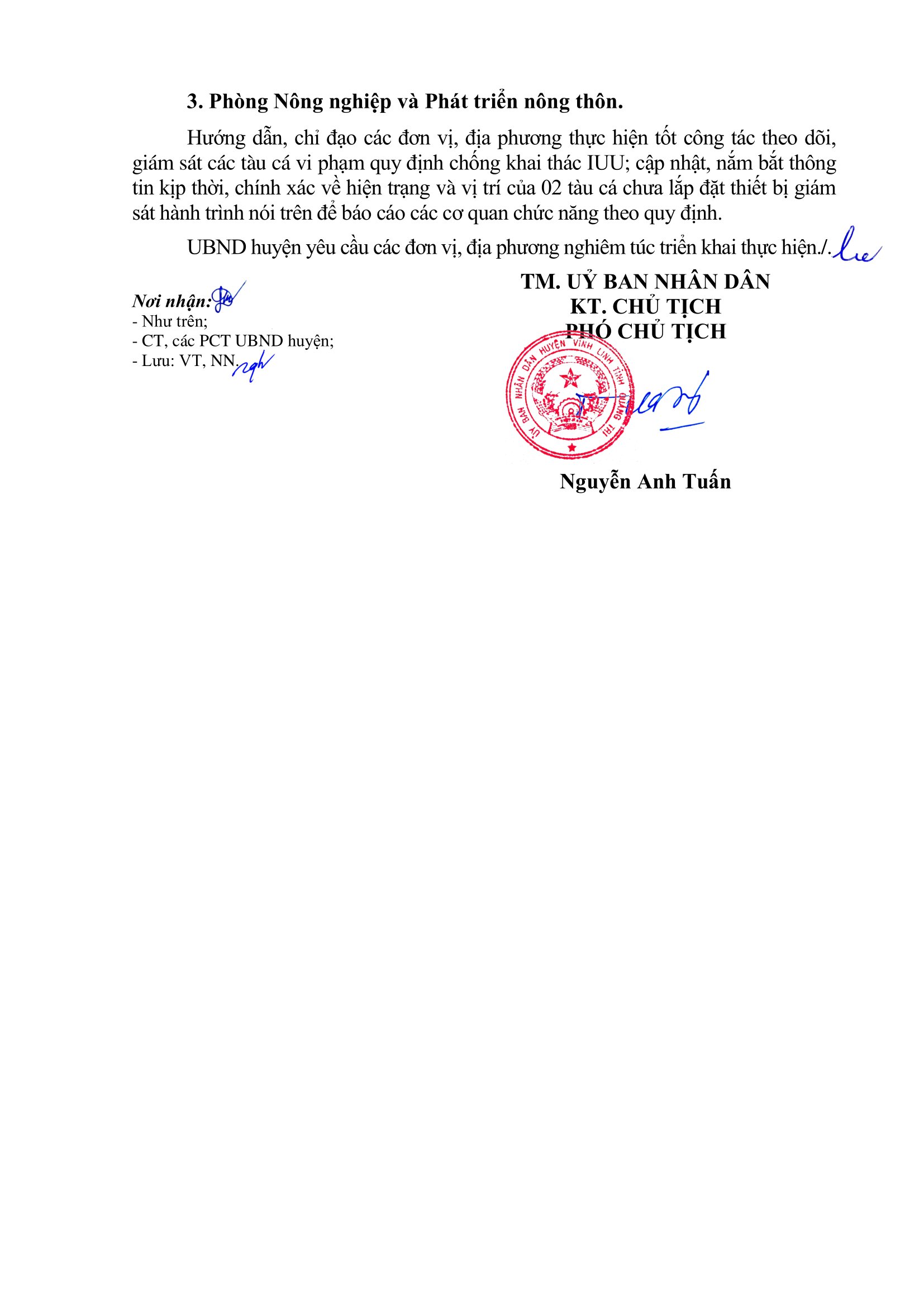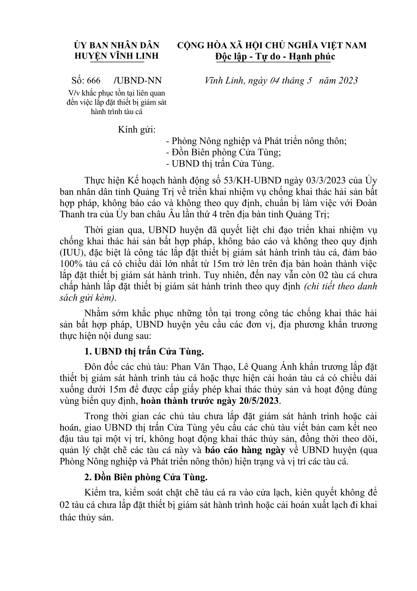 Ngày 4/5/2023, UBND huyện Vĩnh Linh có văn bản chỉ đạo các địa phương, đơn vị liên quan về việc khắc phục tồn tại liên quan đến việc lắp đặt thiết bị giám sát hành trình tàu cá.