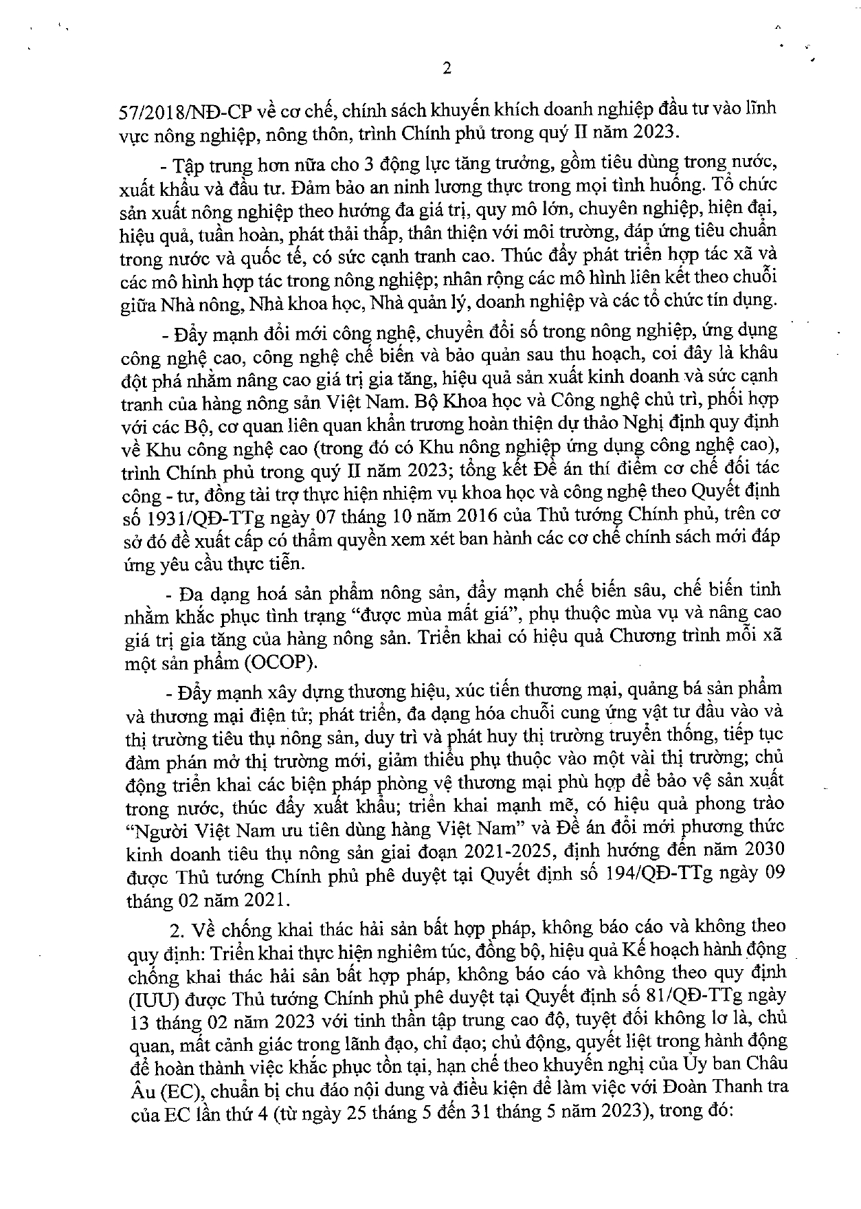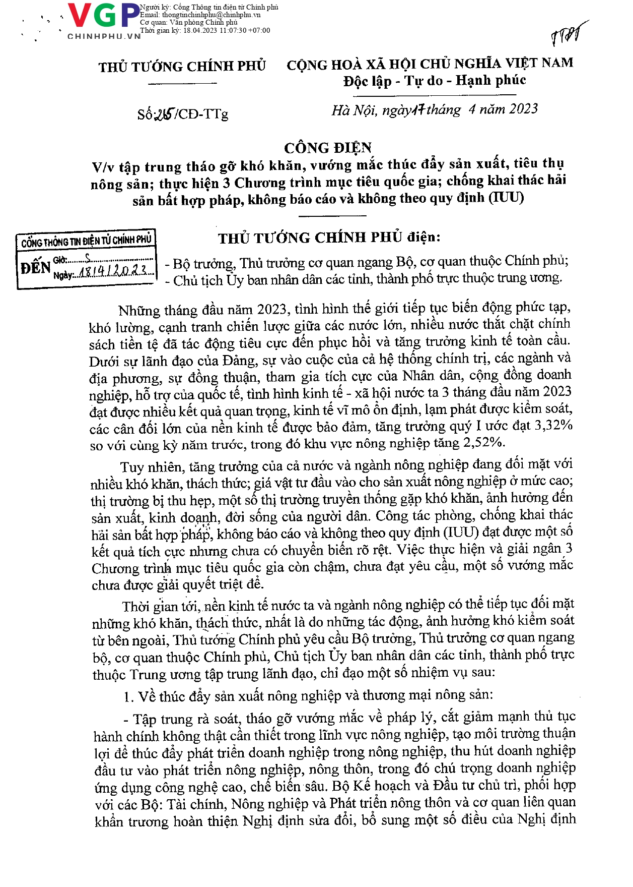 Thủ tướng Chính phủ vừa có Công điện số 265/CĐ-TTg ngày 17/4/2023 về tập trung tháo gỡ khó khăn, vướng mắc thúc đẩy sản xuất, tiêu thụ nông sản; thực hiện 3 Chương trình mục tiêu quốc gia; chống khai thác hải sản bất hợp pháp, không báo cáo và không theo quy định (IUU).