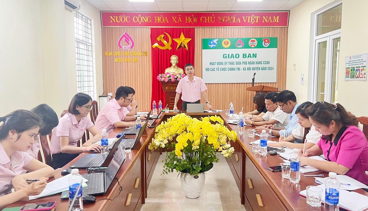Ngày 10/4/2024, Ngân hàng Chính sách xã hội (NHCSXH) huyện Vĩnh Linh tổ chức hội nghị giao ban quý I với 4 tổ chức đoàn thể chính trị - xã hội nhận ủy thác cấp huyện và triển khai nhiệm vụ quý II/2024.