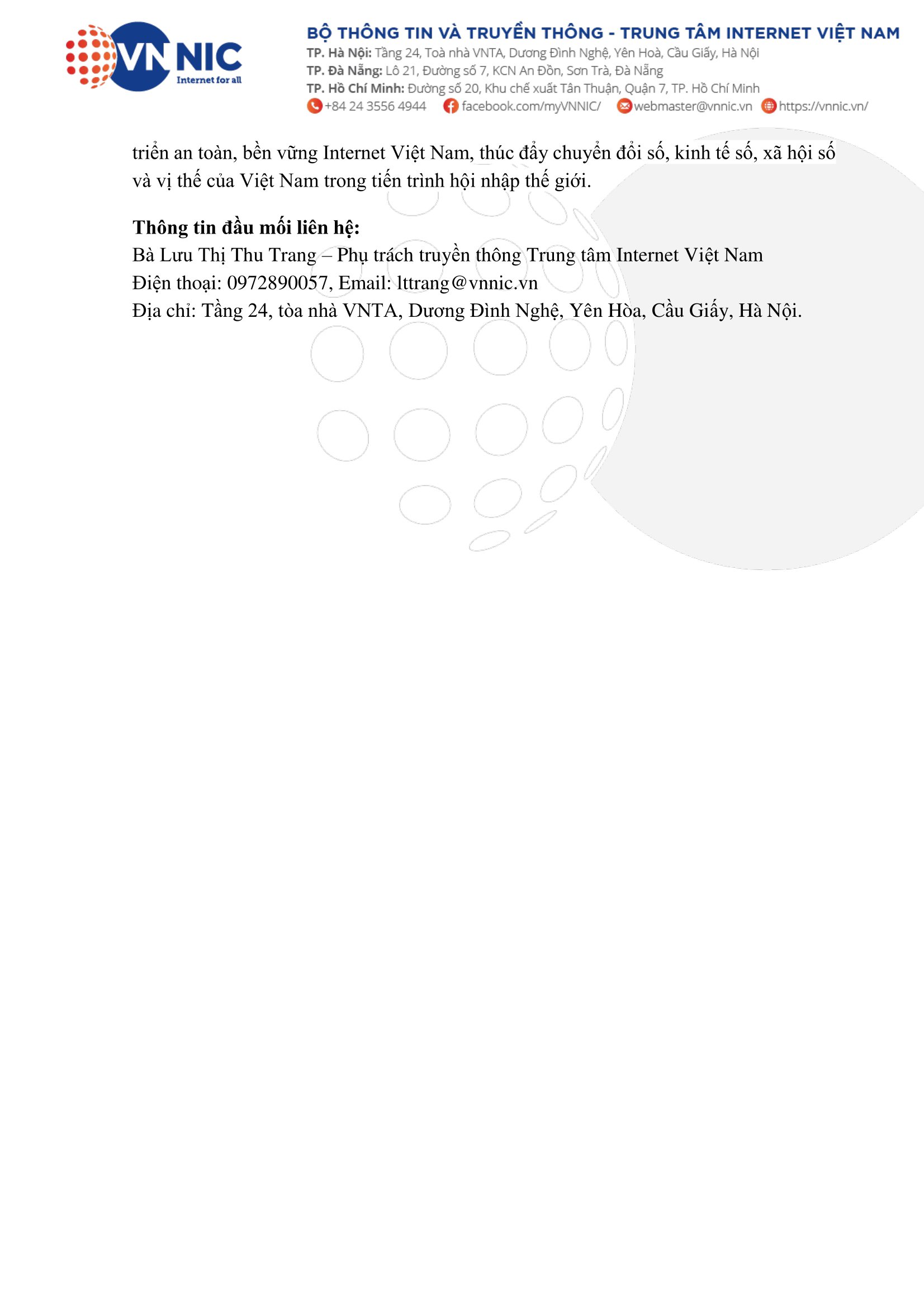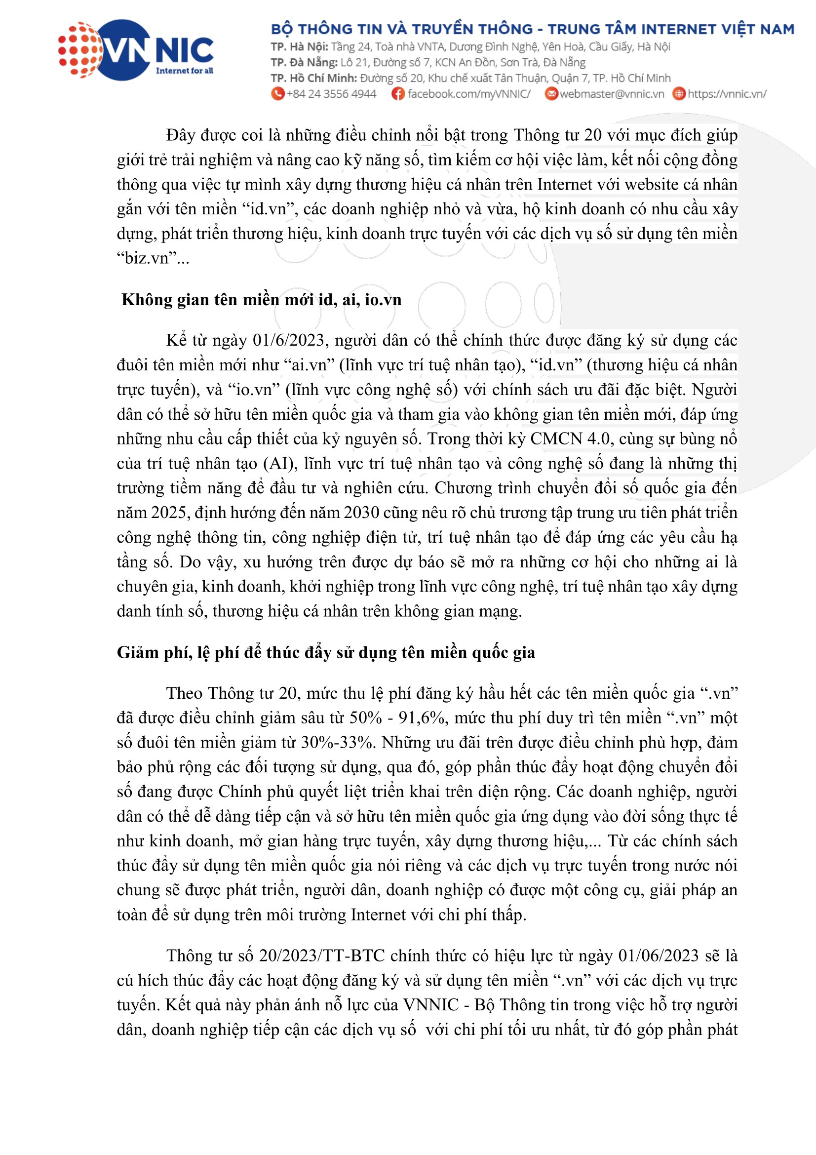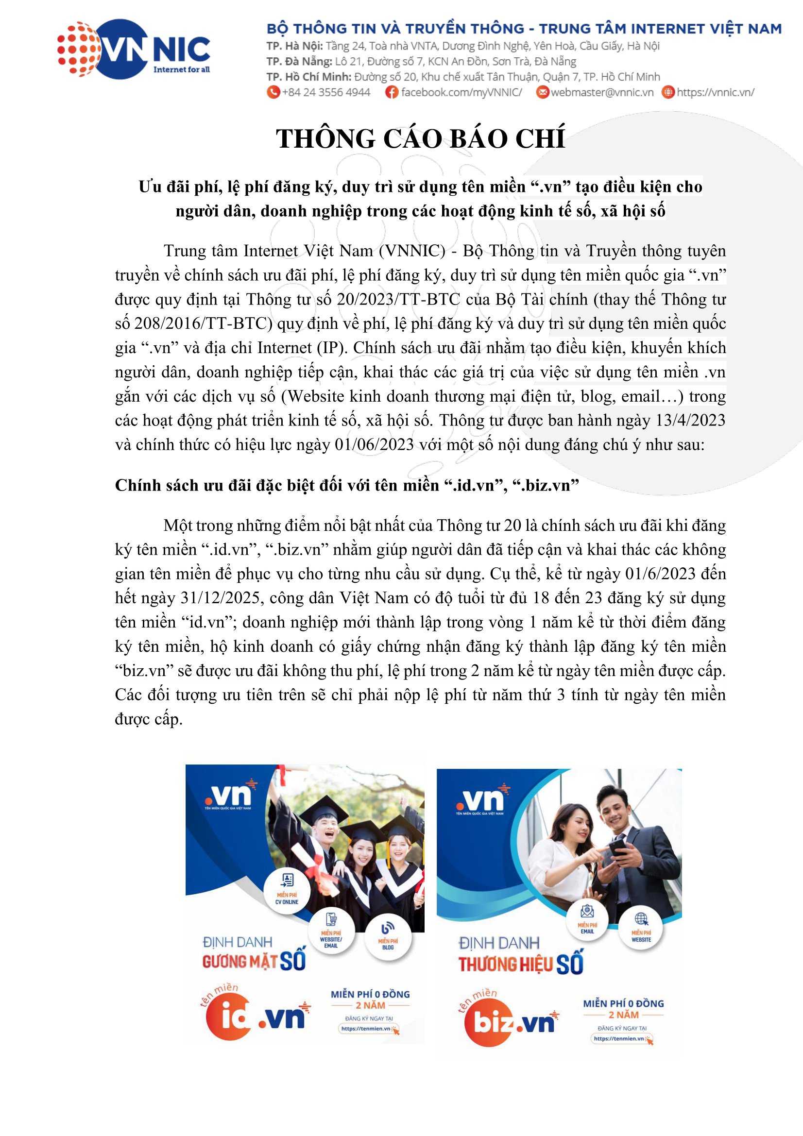 Trung tâm Internet Việt Nam (VNNIC) - Bộ Thông tin và Truyền thông tuyên truyền về chính sách ưu đãi phí, lệ phí đăng ký, duy trì sử dụng tên miền quốc gia “.vn” được quy định tại Thông tư số 20/2023/TT-BTC của Bộ Tài chính (thay thế Thông tư số 208/2016/TT-BTC) quy định về phí, lệ phí đăng ký và duy trì sử dụng tên miền quốc gia “.vn” và địa chỉ Internet (IP).