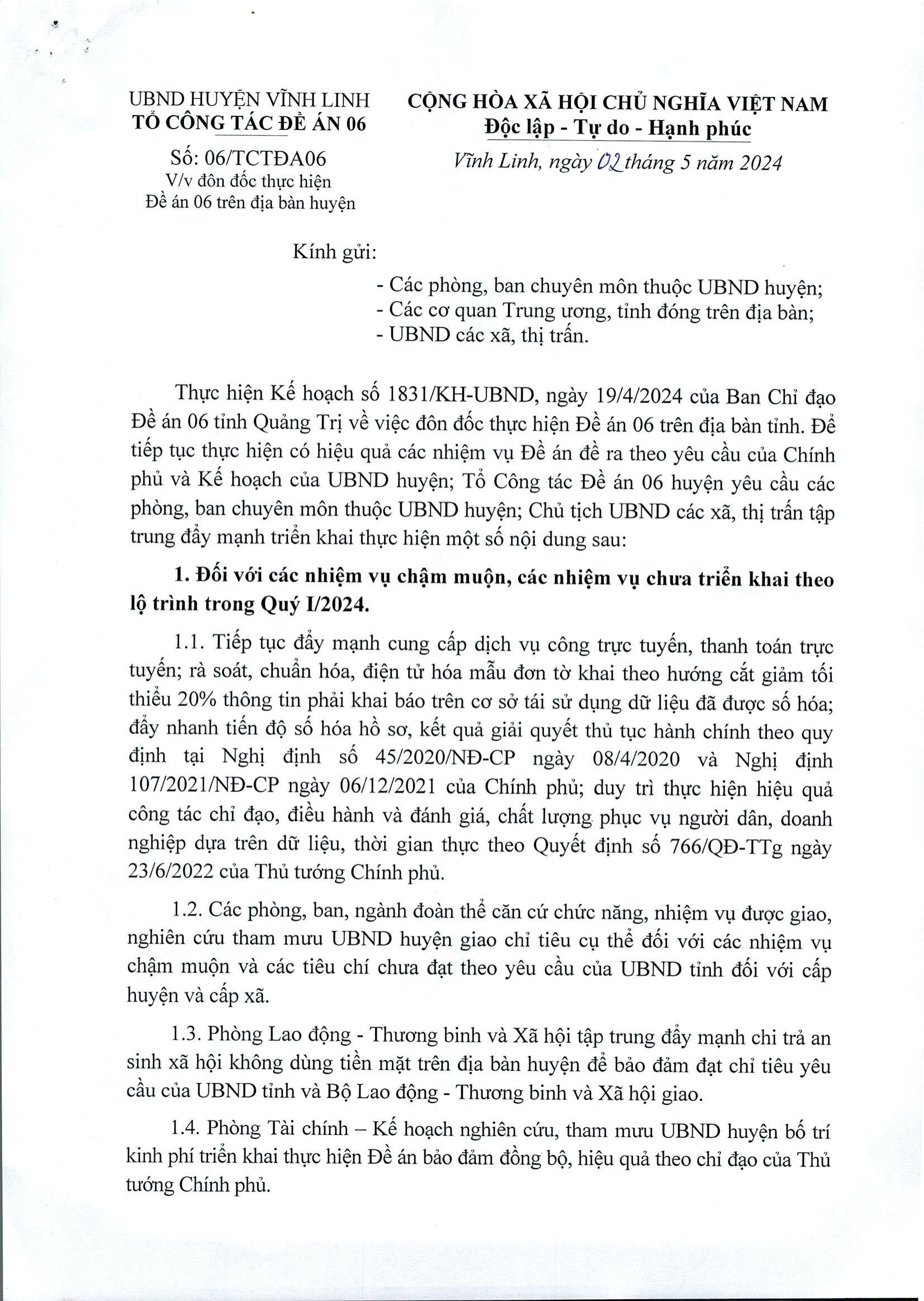 Ngày 02/5/2024, UBND huyện Vĩnh Linh có văn bản yêu cầu các phòng, ban chuyên môn thuộc UBND huyện; các cơ quan Trung ương, tỉnh đóng trên địa bàn; UBND các xã, thị trấn tăng cường thực hiện Đề án 06 trên địa bàn.